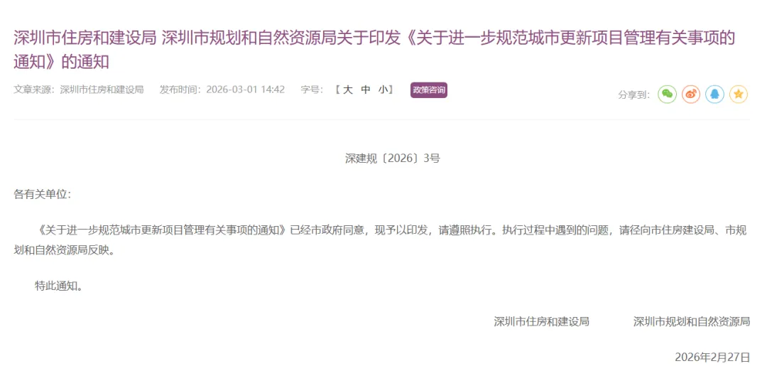深圳市住建局、市规划和自然资源局联合印发深建规〔2026〕3 号《关于进一步规范城市更新项目管理有关事项的通知》,新政自2026 年 3 月 16 日起实施,有效期 5 年,直指未批规划项目的土地移交、保障房配建、清调供盘活、多方协同四大核心痛点,全面衔接《住宅项目规范》(GB55038-2025),激活存量、拉动投资。