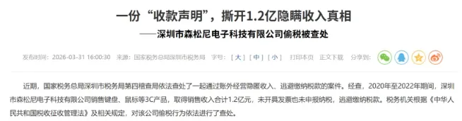 深圳税务部门近日披露一起跨境企业逃税案件。深圳市森松尼电子科技有限公司因在2020年至2022年期间通过账外经营、个人账户收款等方式隐匿销售收入1.2亿元,被依法追缴税费及罚款共计2818.56万元。目前该案已移送公安机关,相关责任人面临刑事追责。
