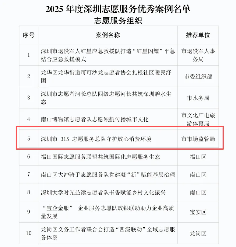 作为全国消费维权志愿服务的一面旗帜,深圳市315志愿服务总队自2013年成立以来,志愿者数量从建队初期的几百人发展到如今的8694人,开展消费维权、消费监督、消费体察、消费调查、消费教育、消费宣传等各类志愿服务活动400余场,建立区级、学校分队15支,着力构建“总队主导、分队协同”的立体志愿服务体系。