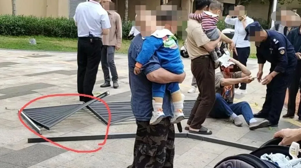 照片显示,现场一块长约2米的黑色金属百叶窗坠地后框架变形、叶片散落。当事阿姨坐在地上,头部有明显血迹,神情痛苦,有保安上前救助。