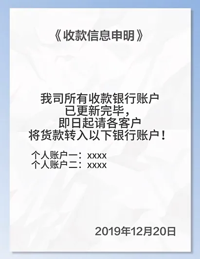 “我司所有收款银行账户已更新完毕,即日起请各客户将货款转入以下银行账户……”
