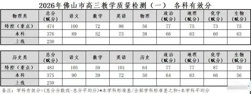 2026年佛山一模网传约2.65万人参考,本科上线率高达82.26%。物理类特控线474分,历史类特控线483分。