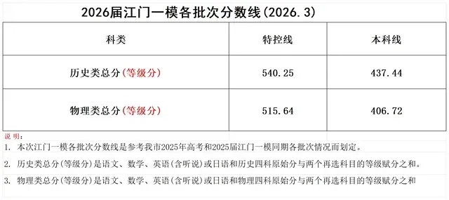 2026年江门一模物理类特控线515.64分,历史类特控线540.25分。