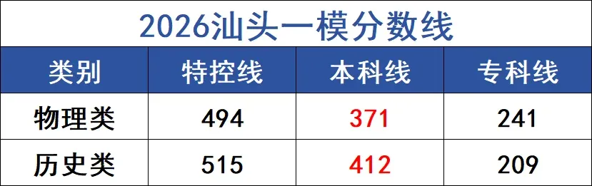 2026年汕头一模物理类特控线494分,历史类特控线515分。