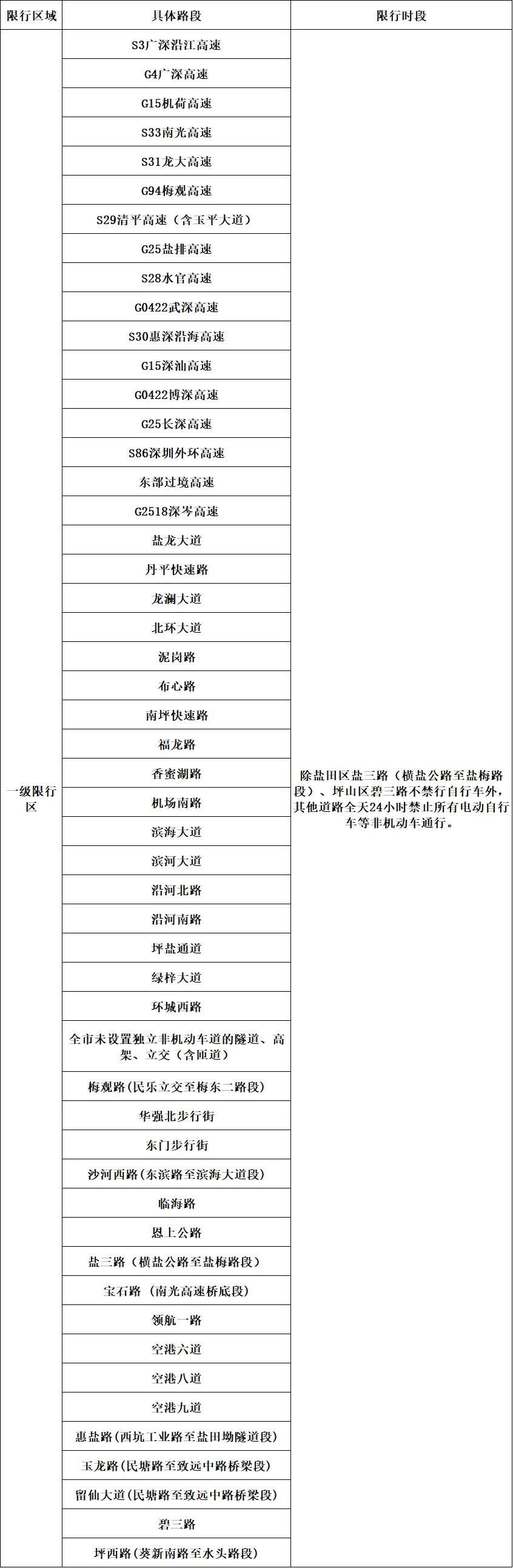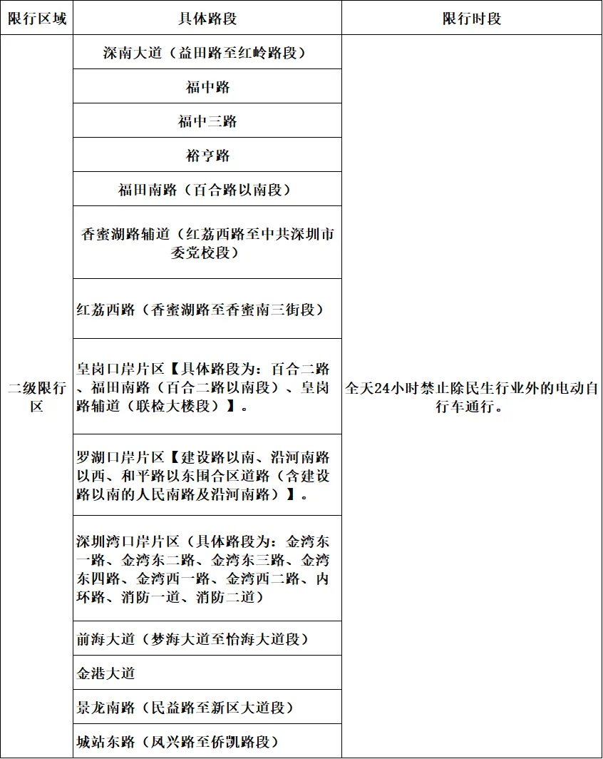 一级限行区中,除盐田区盐三路(横盐公路至盐梅路段)、坪山区碧三路不禁行自行车外,其他道路全天24小时禁止所有电动自行车等非机动车通行。