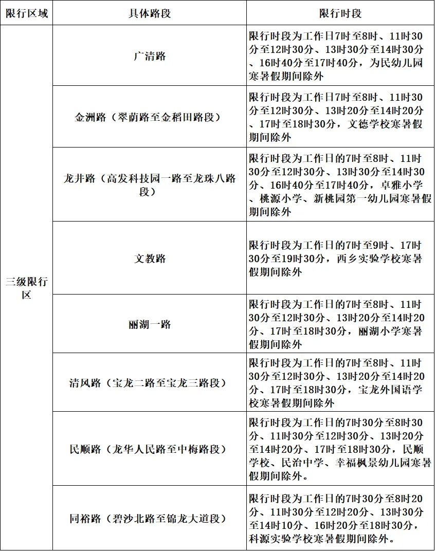 三级限行区设置在部分学校周边道路,分时段禁止除市民用于接送学生上下学以外的电动自行车通行。