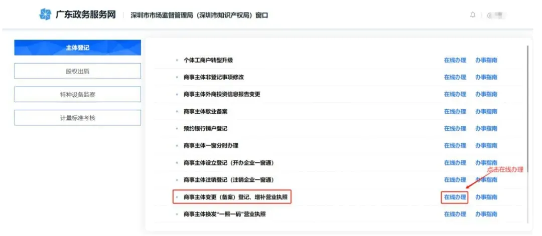 登录后,点击右上角姓名,进入个人中心,再点击“我要申请”,找到“商事主体变更(备案)登记”,进行在线办理。