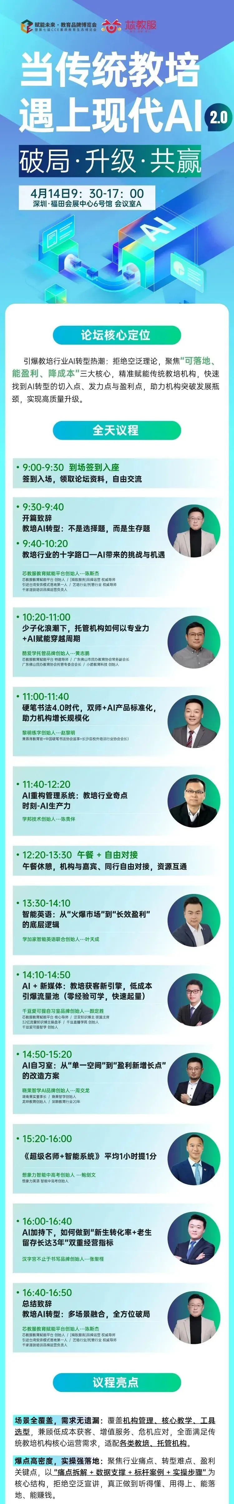 4月14日,“当传统教培遇上现代AI 2.0” 主题论坛将在深圳福田会展中心重磅开启。本次论坛作为“赋能未来·教育品牌博览会暨第七届CCE素质教育生态博览会”的核心活动之一,从托管、书法、智能英语到AI+新媒体、超级名师+智能系统,全天高密度干货,覆盖教培机构运营全场景,助力机构快速找到AI转型的切入点与发力点。长按扫码👆或点击👇,免费领票