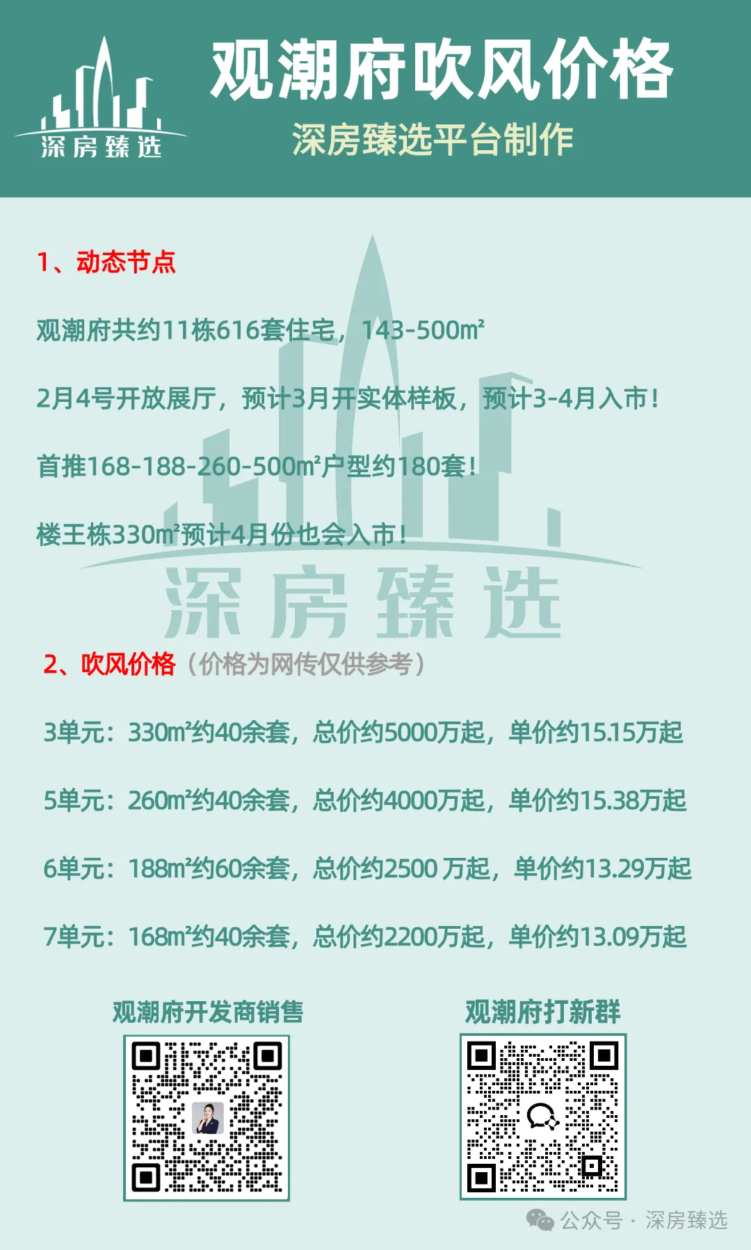 观潮府首推5/6/7单元,约168-260㎡一线海景大平层(还有约500㎡顶楼),网传均价12-15万/㎡!