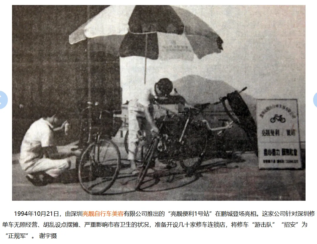 1994年10月22日,《深圳特区报》刊登了亮靓单车便利站的故事,报道此处规范经营,为市民提供方便,还配发了照片。