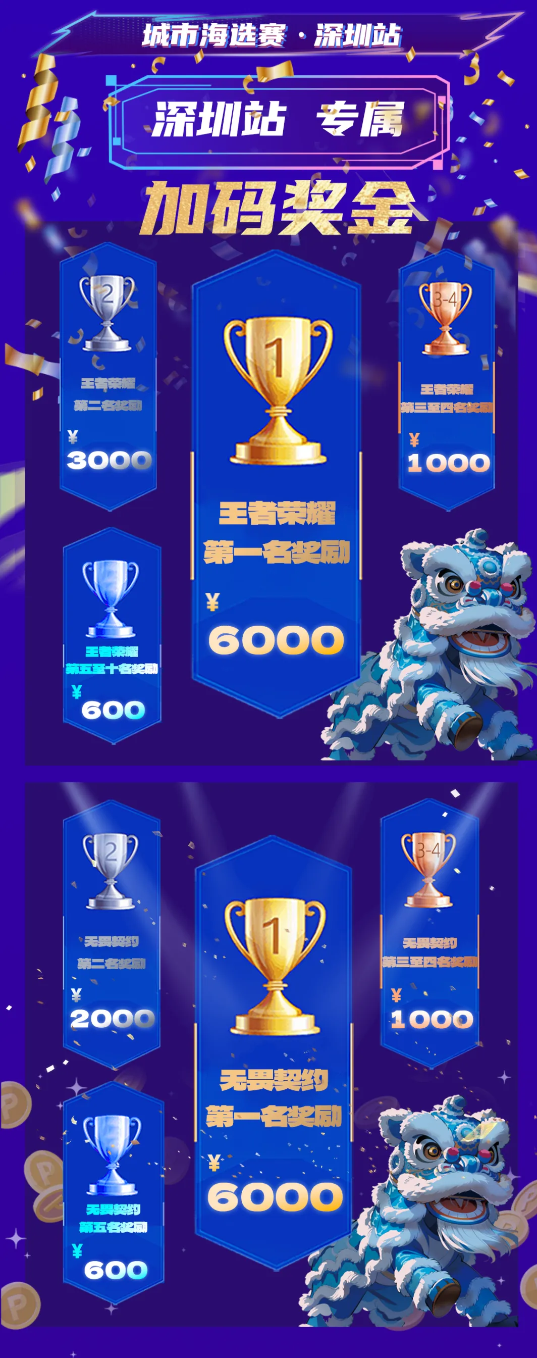 奖牌正面,威猛祥瑞的岭南醒狮与象征守护、对抗与荣誉的战场盾牌浑然一体,蓝红双色的狮眼以机械感线条勾勒,在赛博朋克的光影中,尽显赛场的专注与无畏。醒狮下方,“深圳站”三个烫金大字熠熠生辉,既是这场电竞盛宴主场的契约烙印,更是向每一位逐梦者发出的荣耀邀约。