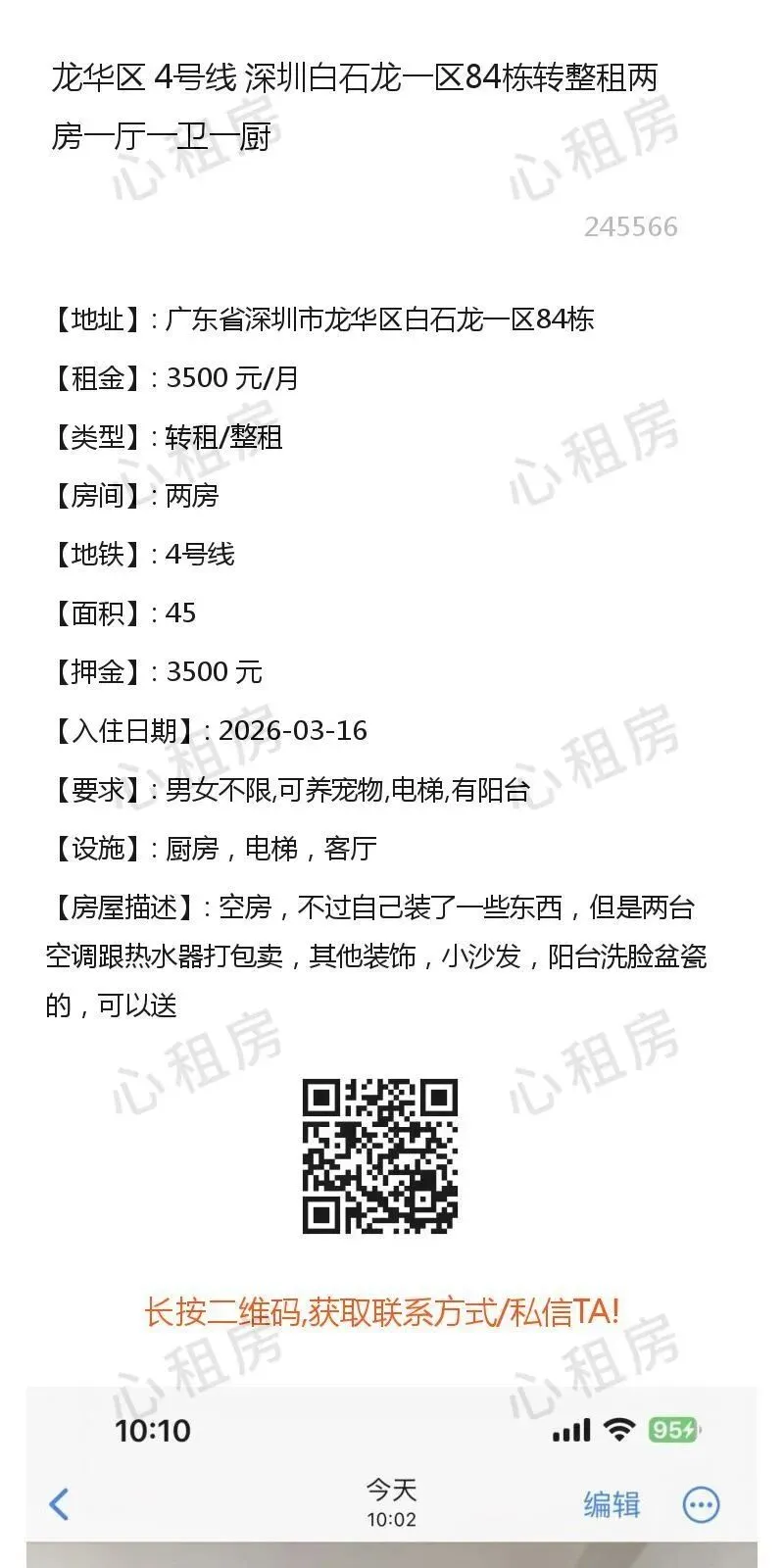 深圳租房【龙华2则】房源①:4号线深圳龙华白石龙一区84栋转整租两房一厅一卫一厨3500元/月;房源②:…