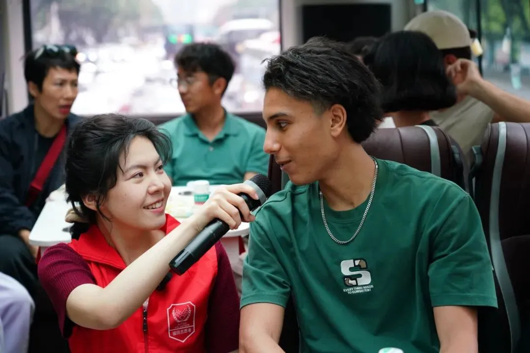 “大家好,我是福田国际青年志愿者李水……”在巴士二层的前排,平时在银行从事数字化工作的李水拿起了麦克风,以流利英文为外籍友人讲解沿途地标。
