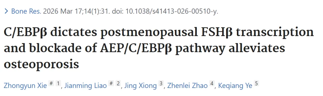 文章来源: Xie Z, Liao J, Xiong J, Zhao Z, Ye K. C/EBPβ dictates postmenopausal FSHβ transcription and blockade of AEP/C/EBPβ pathway alleviates osteoporosis. Bone Res. 2026 Mar 17;14(1):31. doi: 10.1038/s41413-026-00510-y. PMID: 41844581; PMCID: PMC12996317.