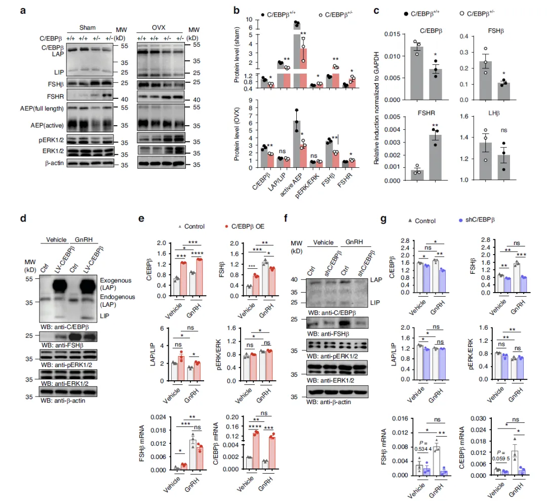 这张图通过动物体内实验与垂体原代细胞体外实验,系统证明 C/EBPβ 是垂体 FSHβ 表达的关键调控因子。在卵巢切除(OVX)与假手术小鼠中,C/EBPβ 杂合缺失会显著降低垂体 FSHβ 蛋白与 mRNA 水平,而不影响 LHβ,同时伴随 AEP 下降、ERK 通路激活以及 GnRHR 表达上升,提示 C/EBPβ 对 FSHβ 具有正向转录调控作用,并对 GnRHR 存在负反馈抑制。在大鼠原代垂体细胞中,过表达 C/EBPβ 可直接提高基础状态下 FSHβ 的表达,而在 GnRH 刺激下则呈现一定的负向调节;敲低 C/EBPβ 则明显削弱 GnRH 诱导的 FSHβ 上升。整体结果说明,C/EBPβ 作为 GnRH 下游的核心转录因子,直接决定垂体 FSHβ 的转录水平,同时参与信号反馈调节。