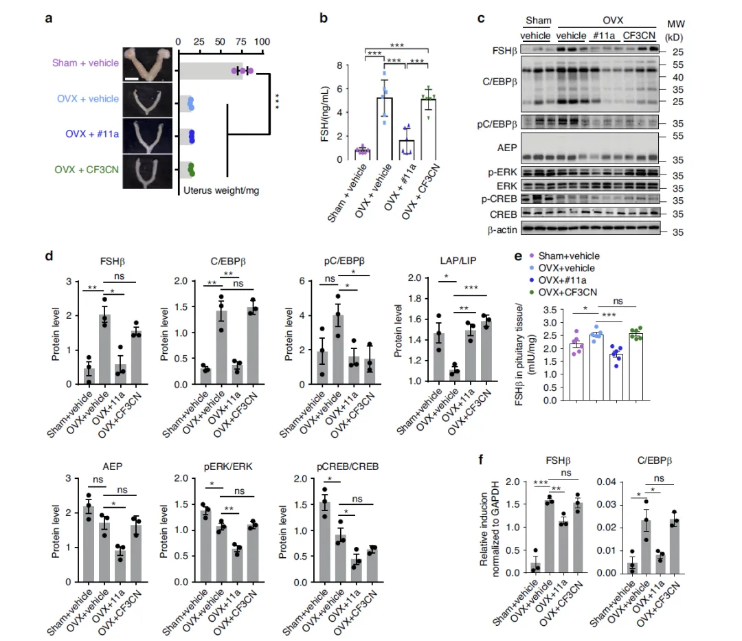这张图重点阐明 AEP 抑制剂 #11a 与 TrkB 激动剂 CF3CN 在调控 FSH 方面的差异。结果显示,OVX 手术成功造成小鼠子宫萎缩,并显著升高血清与垂体 FSH 水平;口服 #11a 可明显降低 OVX 引起的 FSHβ、C/EBPβ、磷酸化 C/EBPβ 以及成熟 AEP 的表达,同时抑制垂体 FSH 合成与分泌,而 CF3CN 对这些指标几乎无影响。进一步检测发现,垂体组织几乎不表达 TrkB 受体,因此 TrkB 激动剂无法作用于垂体调控 FSH。这些结果证明,#11a 通过直接抑制 AEP–C/EBPβ 通路,在垂体层面选择性阻断 FSHβ 的合成,而 CF3CN 不具备中枢抑制 FSH 的能力。