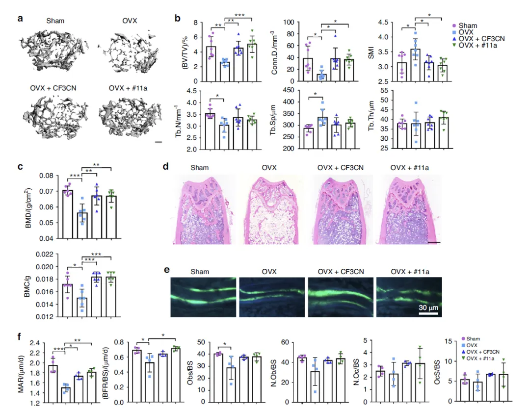 Figure 3:#11a 与 CF3CN 均可改善 OVX 诱导的小鼠骨质疏松,抑制骨转换