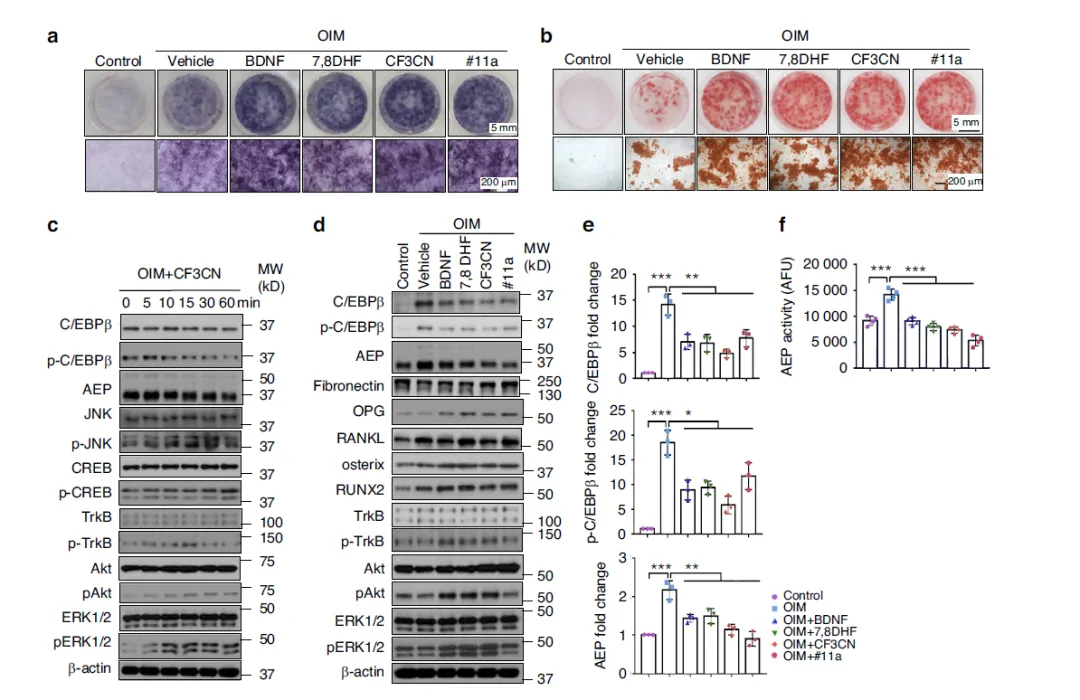 Figure 4:#11a 与 CF3CN 促进成骨细胞分化与矿化,抑制 C/EBPβ/AEP 通路