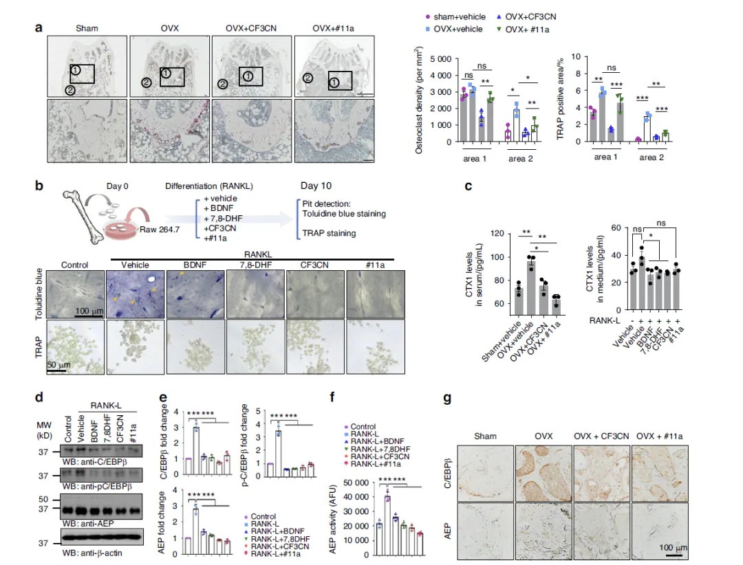 这张图聚焦破骨细胞,证明 #11a 与 CF3CN 可阻断 RANKL 诱导的破骨发生。动物实验中,OVX 显著增加股骨破骨细胞数量与密度,#11a 与 CF3CN 均可使其下降;细胞实验显示,在 RANKL 诱导的 RAW264.7 细胞中,两种药物能减少破骨细胞形成、降低骨吸收陷窝面积,并下调骨吸收标志物 CTX-1。机制上,RANKL 可激活 C/EBPβ/AEP 通路,而 #11a、CF3CN、BDNF、7,8-DHF 均能抑制 C/EBPβ 磷酸化、AEP 表达与酶活。免疫组化也证实,药物可降低 OVX 小鼠骨组织中 C/EBPβ 与 AEP 的信号。整体说明,两种药物通过抑制 C/EBPβ/AEP 通路,直接阻断破骨分化与骨吸收,发挥骨保护作用。