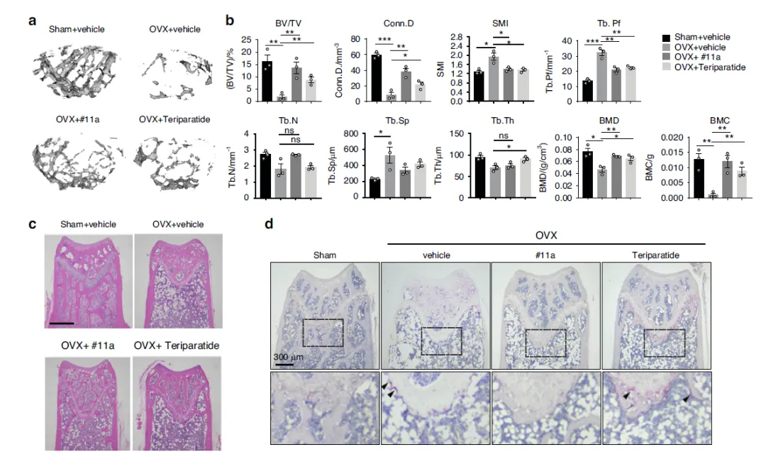 这张图通过头对头比较,确立 #11a 作为骨质疏松候选药物的疗效价值。在 OVX 小鼠中,#11a 与特立帕肽干预后,μCT 检测的骨体积分数、连接密度、骨小梁数量等结构指标均显著回升,骨分离度下降;DXA 结果显示两者均可恢复骨密度与骨矿含量;H&E 染色可见骨髓脂肪化减少,骨小梁更密集;TRAP 染色显示破骨细胞数量明显下降。各项指标均证明,#11a 在改善骨微结构、提升骨密度、抑制骨吸收方面,与已上市的成骨性药物特立帕肽效果相当,具备成为新型抗骨质疏松药物的潜力。