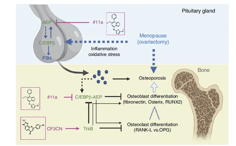 这张模式图整合全文机制,清晰展示绝经后骨质疏松的调控通路与药物作用位点。绝经 / OVX 引发炎症与氧化应激,激活垂体 C/EBPβ,进而直接转录上调 FSHβ,使 FSH 升高并作用于骨骼,激活 C/EBPβ/AEP 通路,促进破骨、抑制成骨,最终导致骨质疏松。AEP 抑制剂 #11a 可同时在垂体抑制 C/EBPβ–FSH 轴,并在骨骼阻断 AEP、保护纤连蛋白、提升 OPG,实现 “中枢降 FSH + 外周护骨” 双重作用;而 TrkB 激动剂 CF3CN 因垂体无 TrkB,无法降低 FSH,仅在骨骼局部激活 TrkB–Akt 通路抑制 C/EBPβ/AEP,促进骨形成、抑制骨吸收。该图直观揭示两种药物的作用差异与关键通路靶点。