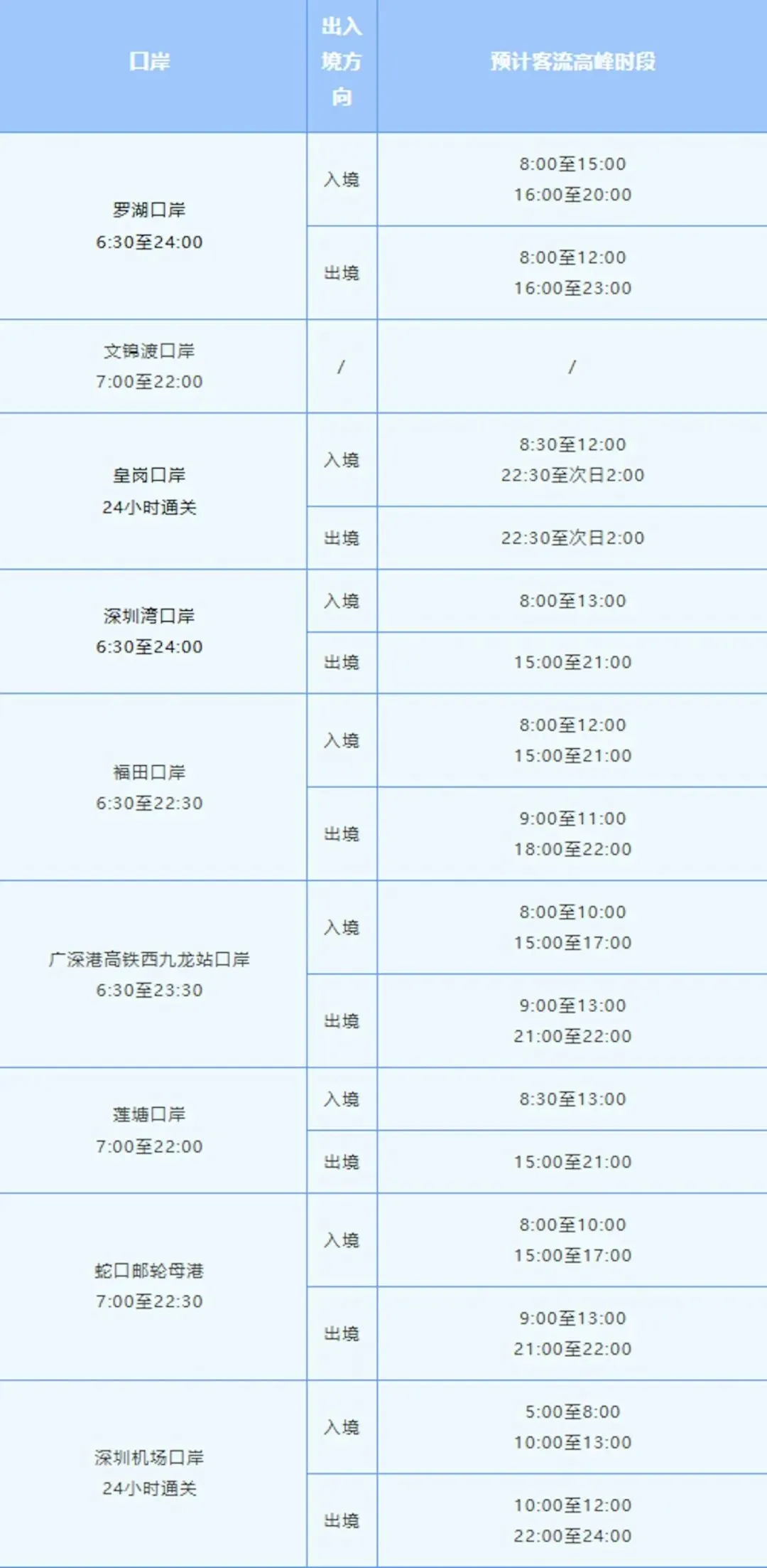深圳政府口岸办公室旗下“深圳口岸发布”公众号公布长假期间各口岸预计高峰时段,以帮助旅客避开过关人潮。