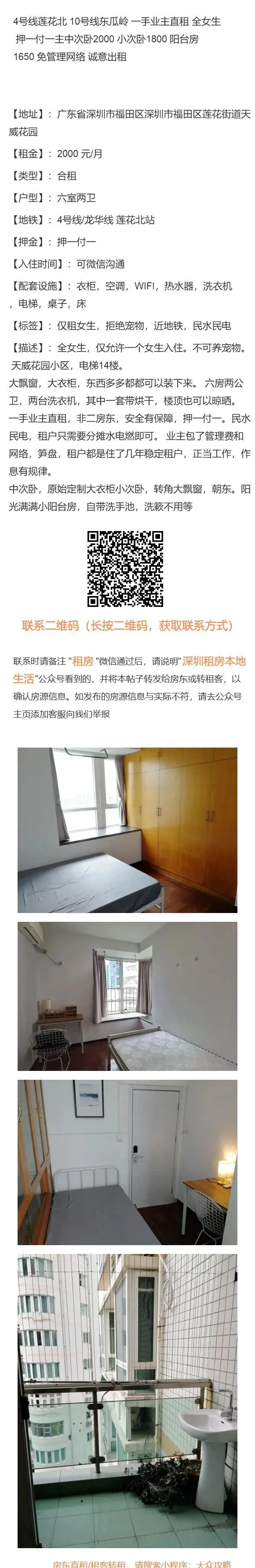 4号线莲花北 10号线东瓜岭 一手业主直租 全女生 押一付一主中次卧2000 小次卧1800 阳台房1650 免管理网络 诚意出租