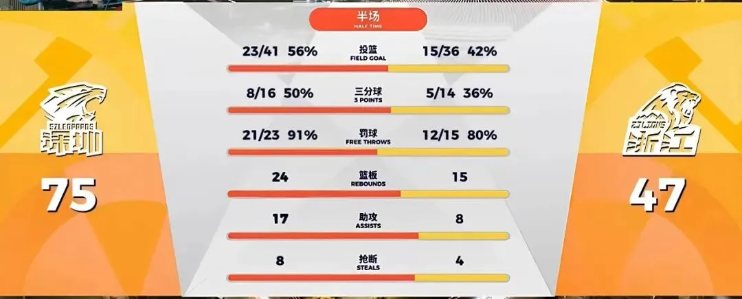 最近的深圳连胜频频,好几场都是大比分碾压,看得人直呼过瘾。今天这场深圳对阵浙江,同样都是7连胜的两队光看排名还以为是势均力敌的强强对话:卫冕冠军浙江广厦第二,深圳第七,谁能想到比赛刚打完一半,比分直接定格75:47,深圳领先 28 分,半场就把对手打懵了。