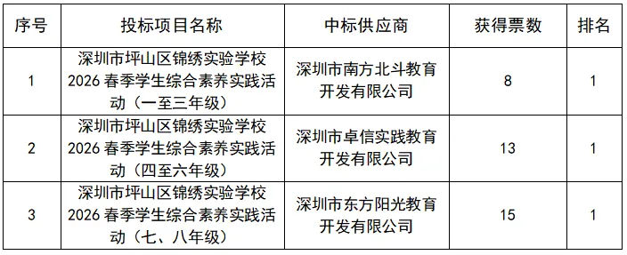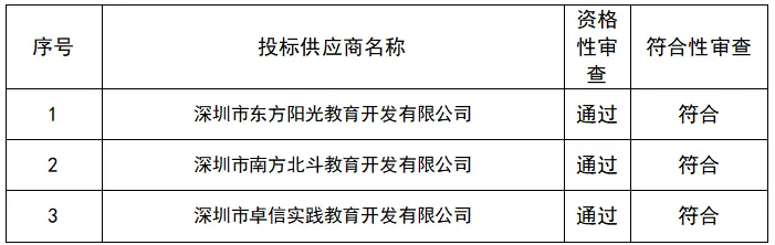 截至公告期满,共有六家公司参与投标。学校家长委员会组织一至八年级家长代表对各个公司的标书进行资格初审,选出三家公司入围,他们分别是:深圳市东方阳光教育开发有限公司、深圳市南方北斗教育开发有限公司、深圳市卓信实践教育开发有限公司。