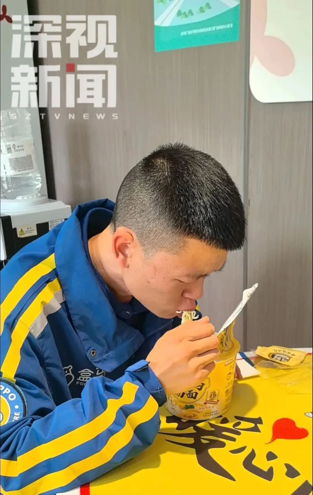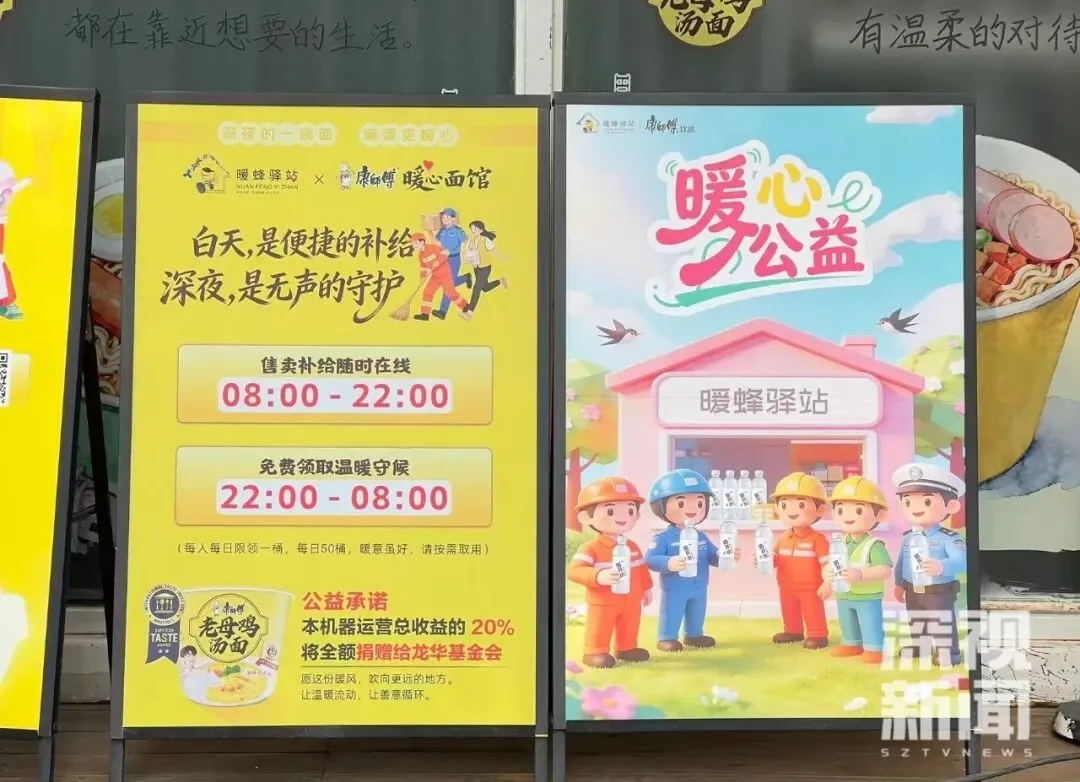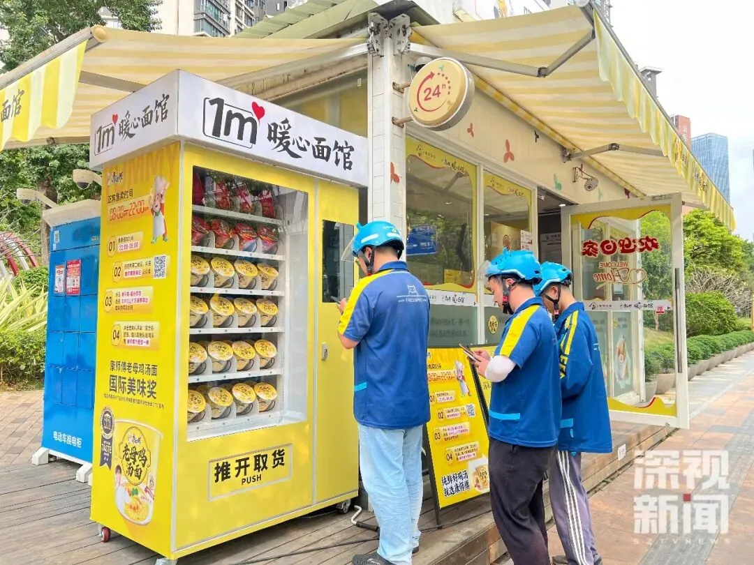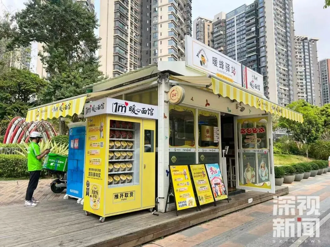 这间红山社区暖蜂驿站“1平米暖心面馆”,位于深圳市龙华区民治街道红山社区民繁路与旺民街交汇处东南侧约50米处,是广东省首家以“公益+商业”模式运营的社区爱心面馆。面馆依托社区原有驿站的基础设施,由康师傅提供每日限量50桶的免费老母鸡汤面,并负责货源的每日补充。其运营模式充满巧思:从晚上22点到次日早上8点,面馆为外卖骑手、快递员、环卫工人以及夜间有需要的人群免费提供泡面;而在白天时段(8点至22点),面馆则通过售卖模式运营,每售出一桶面,便向红山社区爱心基金捐赠1元,活动结束后将置换为同等价值的方便面进行捐赠,实现了公益的“自我造血”。记者在现场注意到,小小的面馆空间整洁温馨,自助柜机上放置着陈列好的泡面。陆续有外卖骑手停好电动车,走向自助柜机,扫码、取面。暖蜂驿站的休息区内,几名刚取完面的骑手正坐在桌旁,一边等水烧开,一边刷着手机。