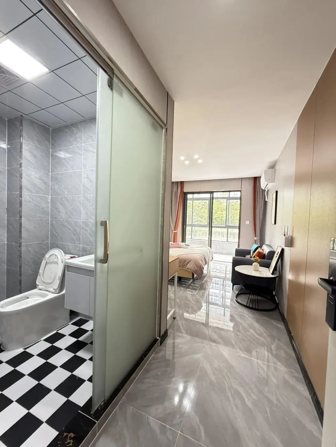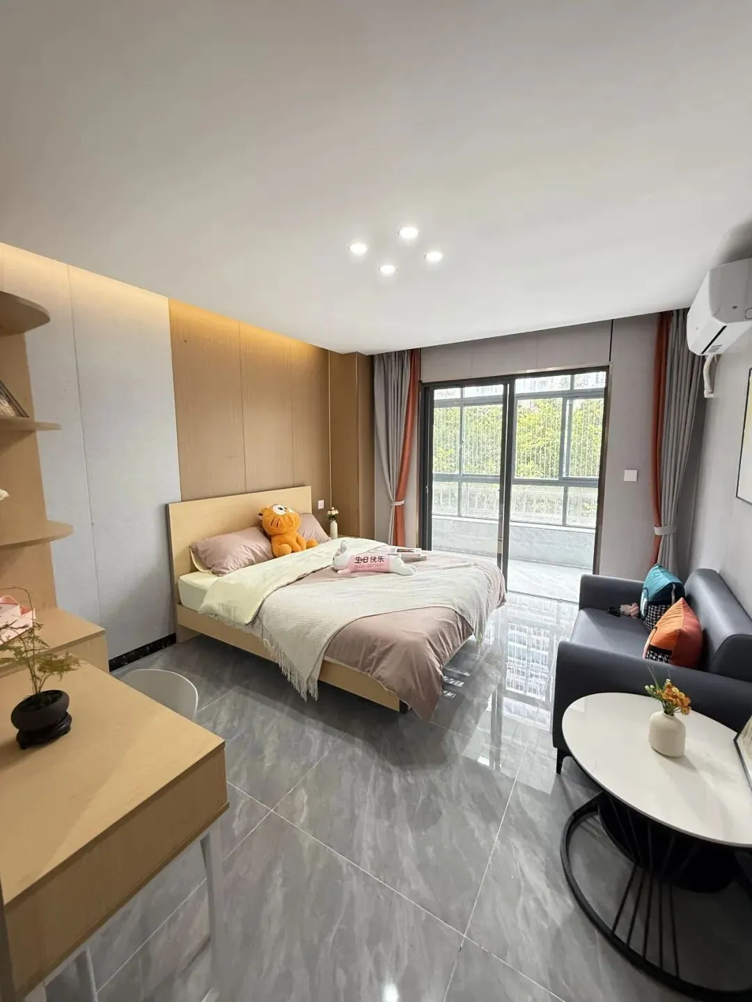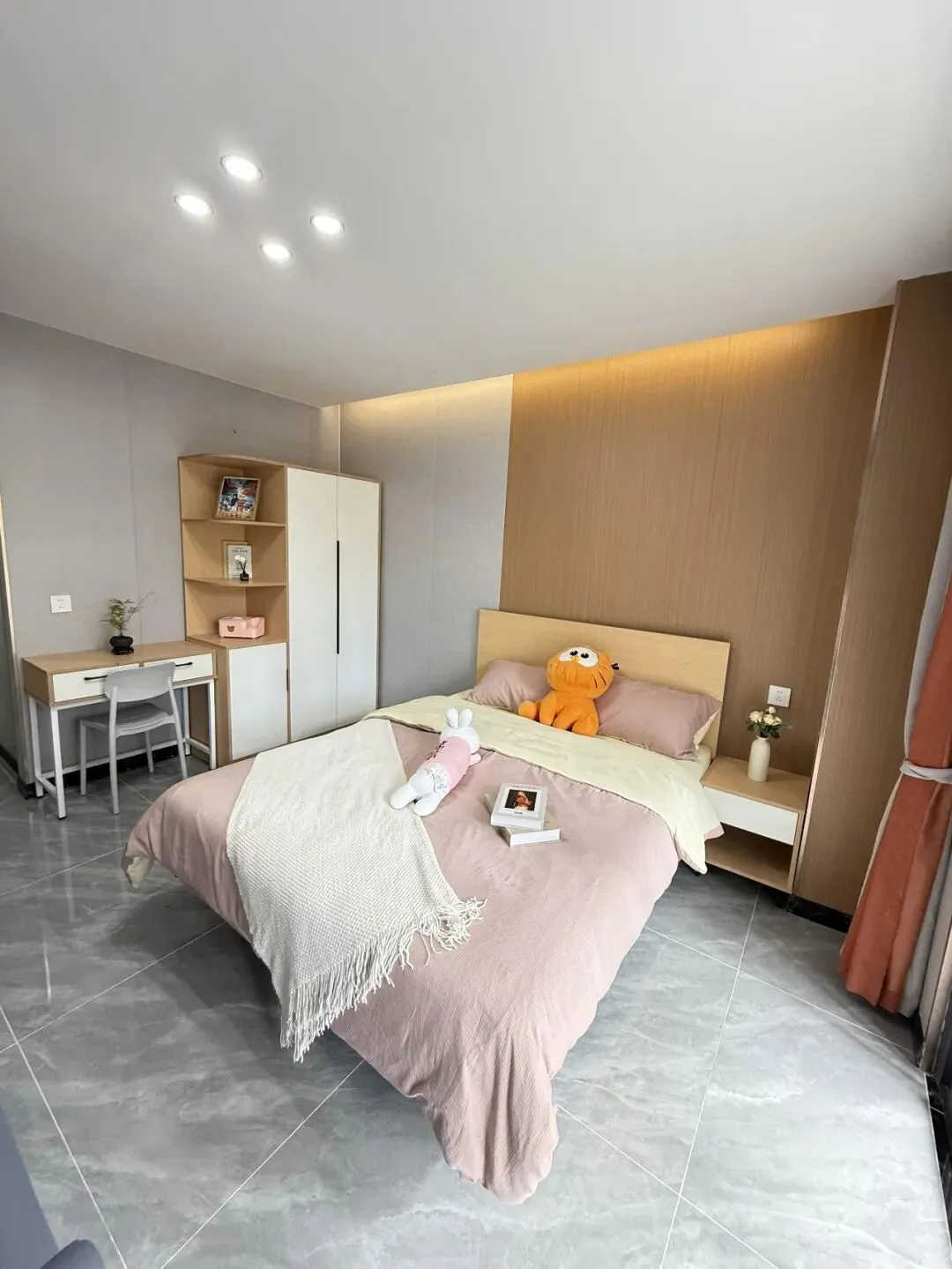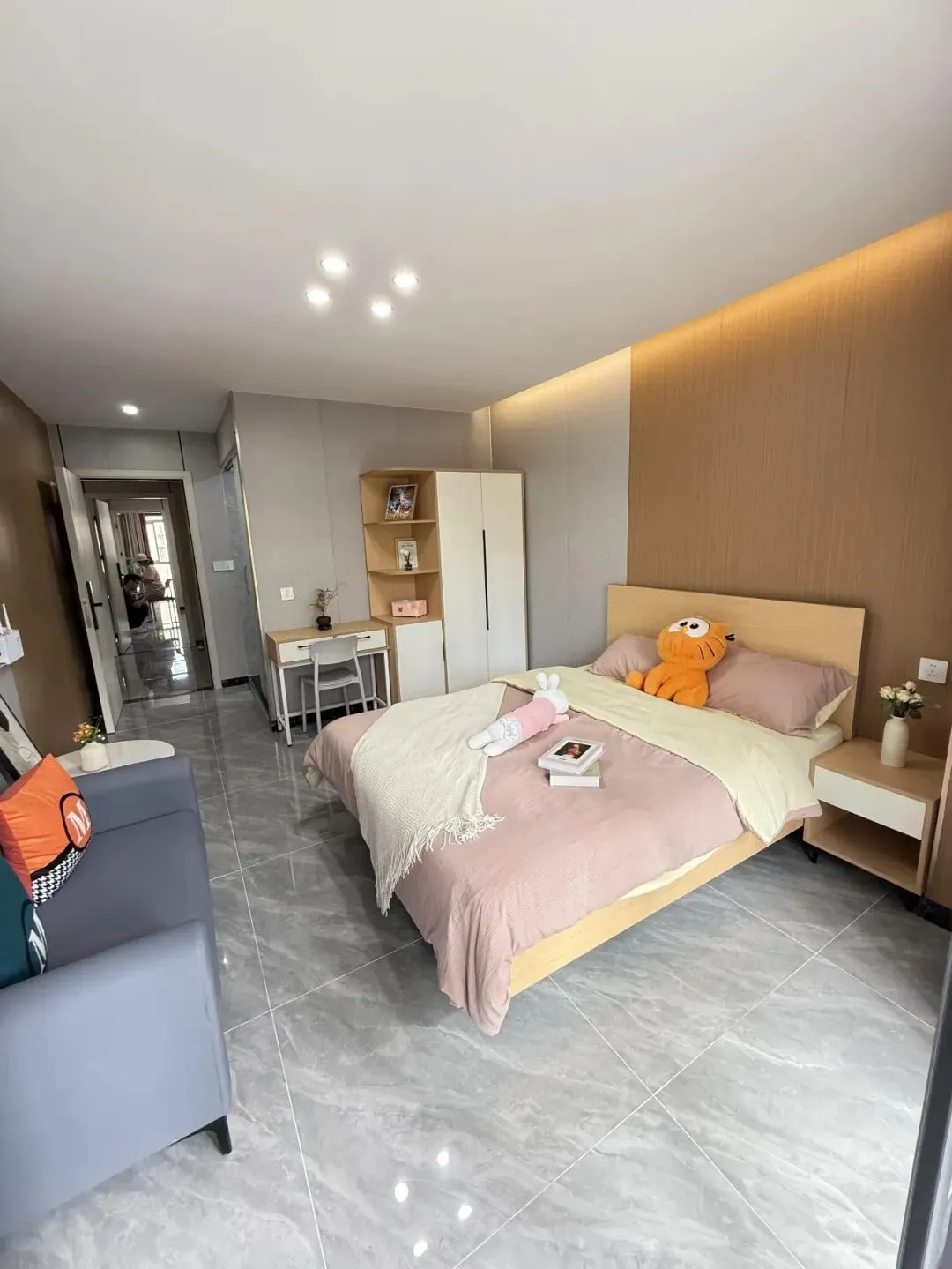 床冰箱衣柜桌子椅子电磁炉油烟机空调、热水器、洗衣机可拎包入住,楼上有大天台可以晒被子! 楼下有美宜佳、超市、菜鸟驿站非常方便,房间属于大单间,隔音很好不用怕吵,可以养宠物猫,外卖,朴朴可以免费送上门,白天夜间都有管家,水电表随时可自查,自己住做饭和开空调一个月用下来费用在120左右。