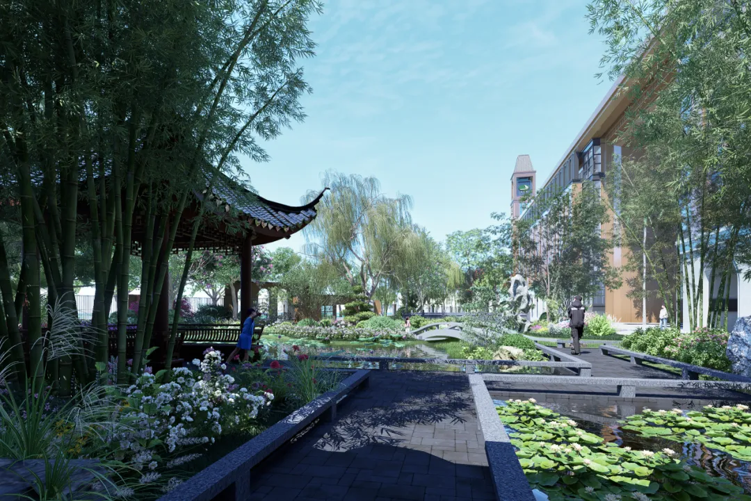 永久校区校园以 “山水方舟” 为核心理念规划设计,以山之脉络勾勒校园肌理,通过中央学习街串联起各庭院与建筑群,以水为纽带衔接各处景观庭院,兼具江南园林的雅致意韵与岭南自然的灵秀之美。整体建筑群取舟之形制,宛若在坪山河畔扬帆启航。