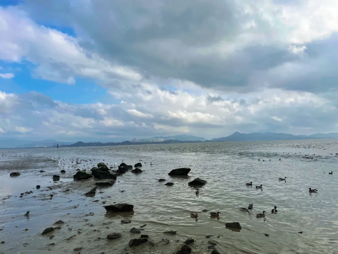 继续往前,浅滩之上,水鸟悠然嬉戏,游人静静驻足相望。不打扰,是这座城市对自然最温柔的敬意;海风拂面,是自然回馈给生活最惬意的温柔。