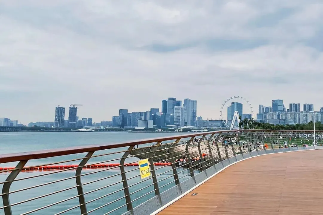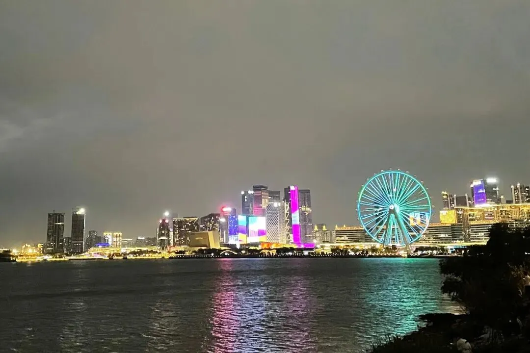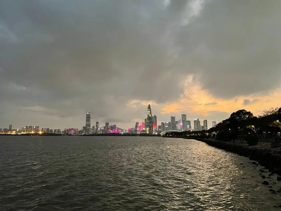 暮色降临,对岸楼宇与摩天轮次第点亮,五光十色,将湾区夜色衬得格外迷人。