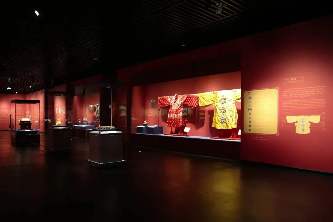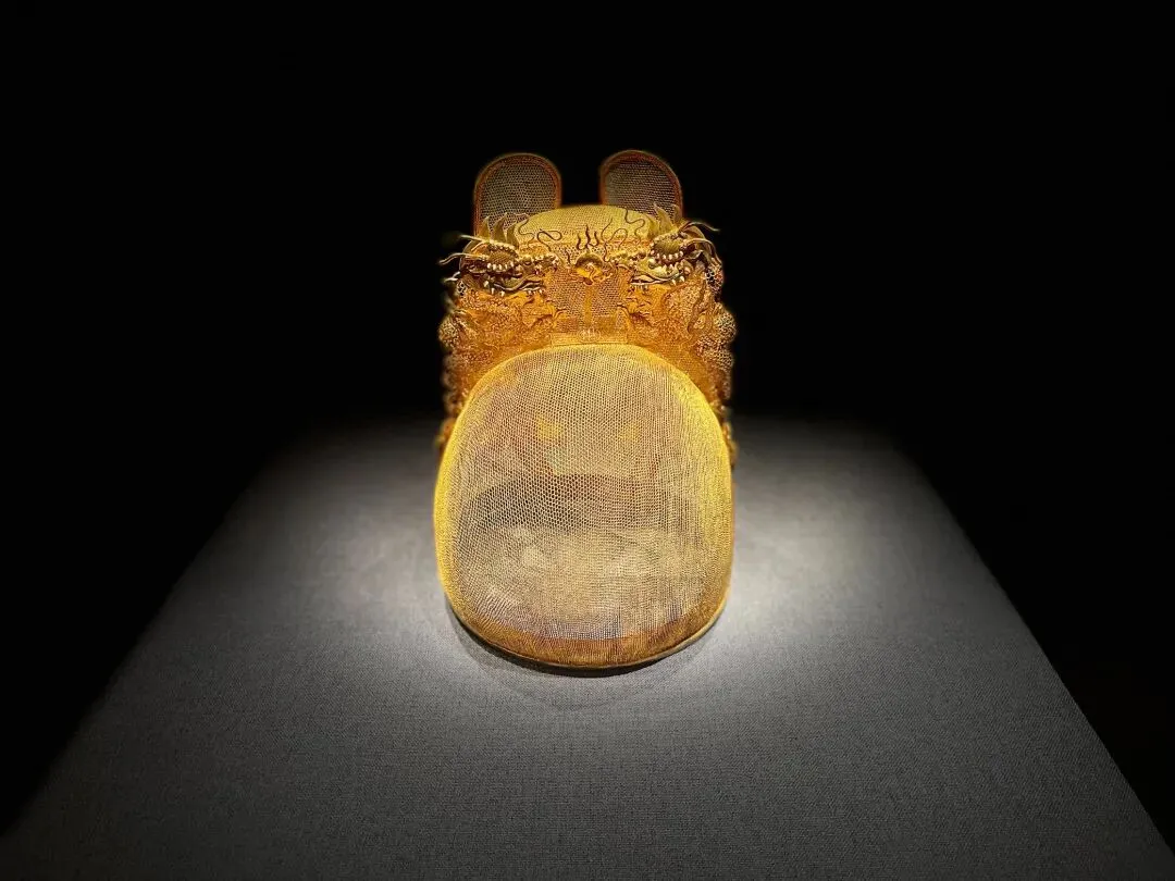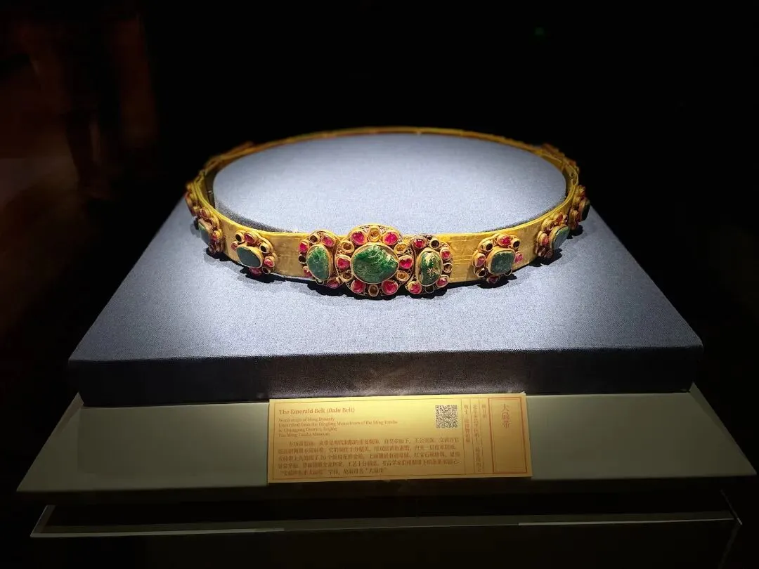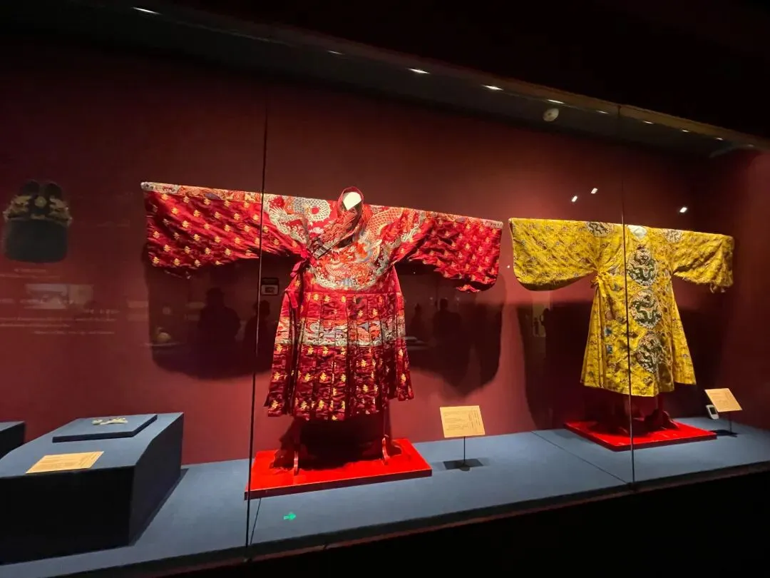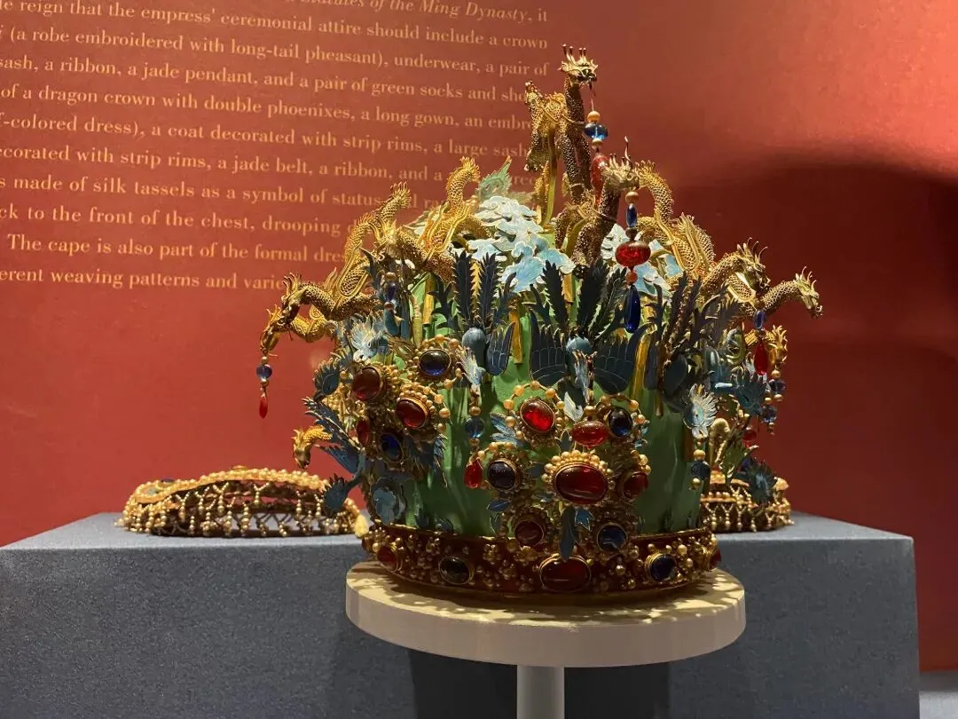 华丽精美的服饰、巧夺天工的工艺让人驻足不前:镶满祖母绿、红宝石与珍珠的大碌带,缂丝十二章福寿如意衮服、绛红织金寿字妆花缎衬褶袍、乌纱翼善冠、绿织金妆花缎立领女夹衣、十二龙九凤冠……即便只是复制品,依旧尽显皇家气派与极致匠心,一眼沦陷,挪不开脚步。