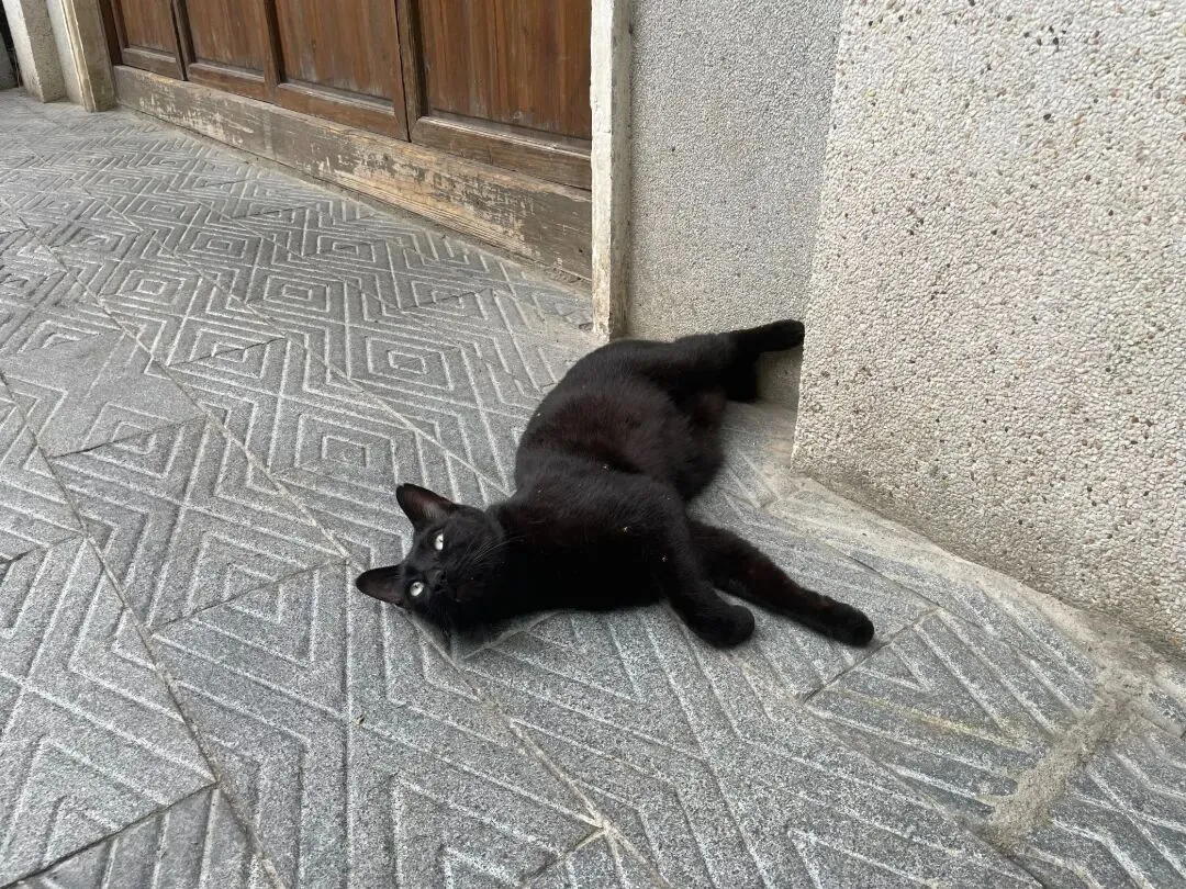 (松弛慵懒的猫咪,躺在一旁看着街巷人来人往)