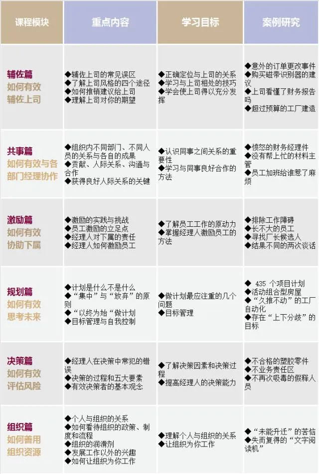 这是一门既澄清理念又提升技能的课程,通过学习该课程,经理人将更好地认识自己在组织中的角色、并清晰如何围绕“责任”“贡献”和“成果”更好地开展工作,进而提高个人管理技能,打造高绩效团队。