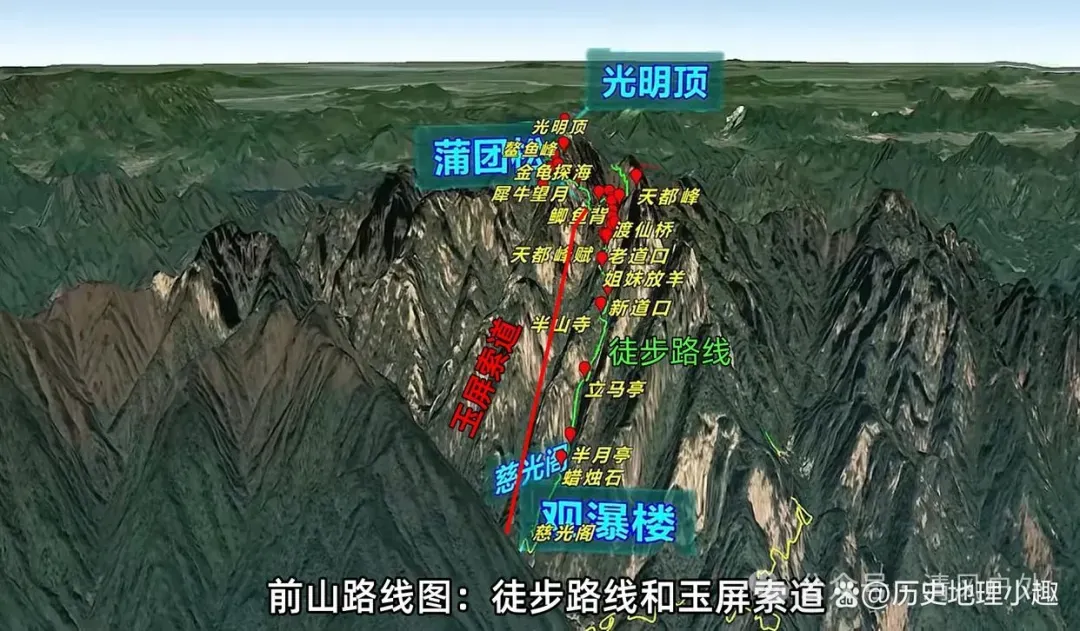 下山暂定选择前山路线,徒步下山的话,,这条路线景点最多,有蜡烛石、半月亭、新道口、天都峰、鲫鱼背、老道口、迎客松、玉屏楼、莲花峰、百步云梯、鳌鱼峰、光明顶等。