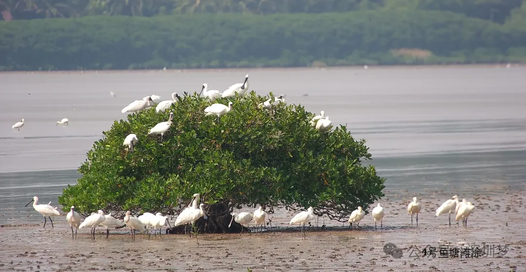 高清摄像头记录到滩涂上的红树与黑脸琵鹭。图源:福田红树林保护区