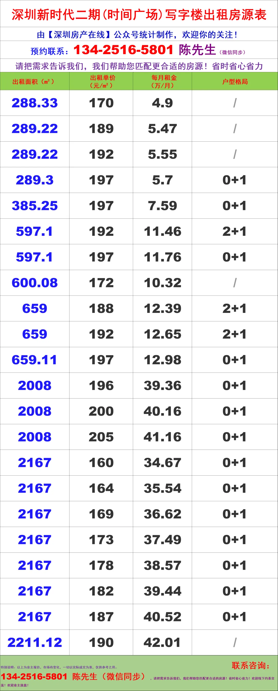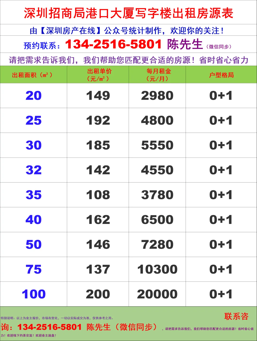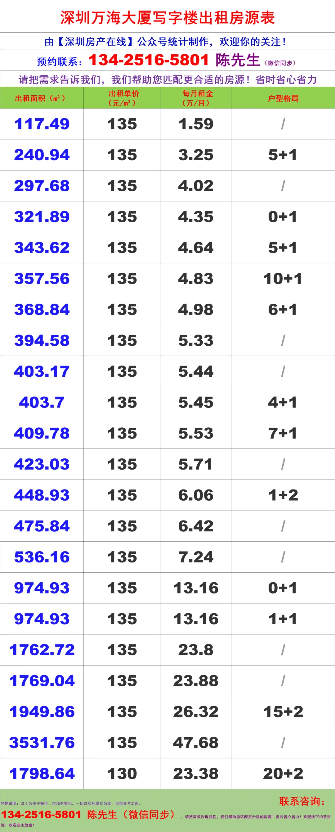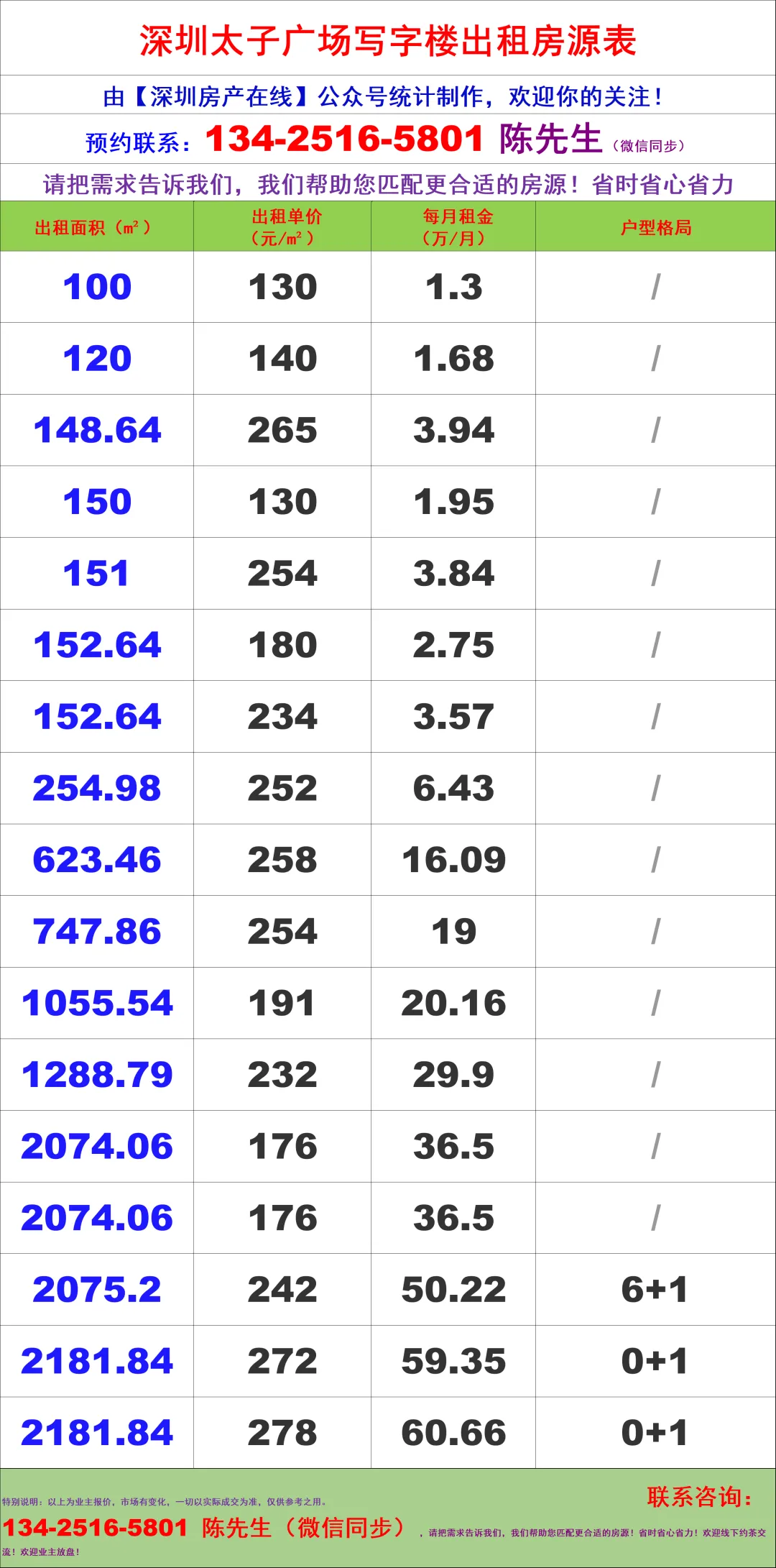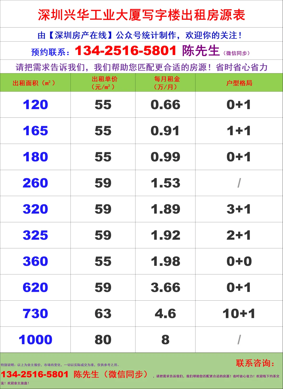 【深圳房产在线】陈经理写字楼租售团队:134-2516-5801 (微信同步)