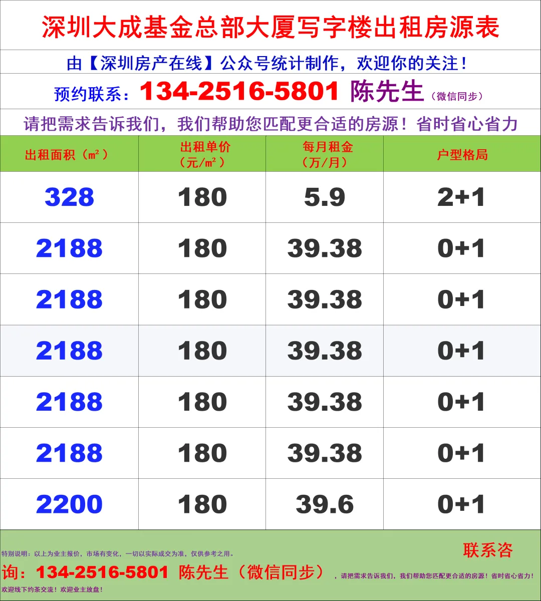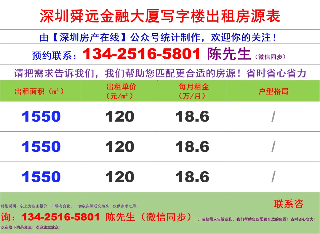 【深圳房产在线】陈经理写字楼租售团队:134-2516-5801 (微信同步)