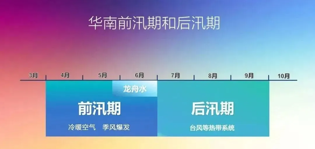 一般来讲,在华南地区,4月至6月为第一个多雨季节,7月至9月为第二个多雨季节。这两个雨季带来的大量降水会导致河水的显著上涨,因此叫做汛期。两个多雨季节时间一前一后,就有了“前汛期”和“后汛期”。