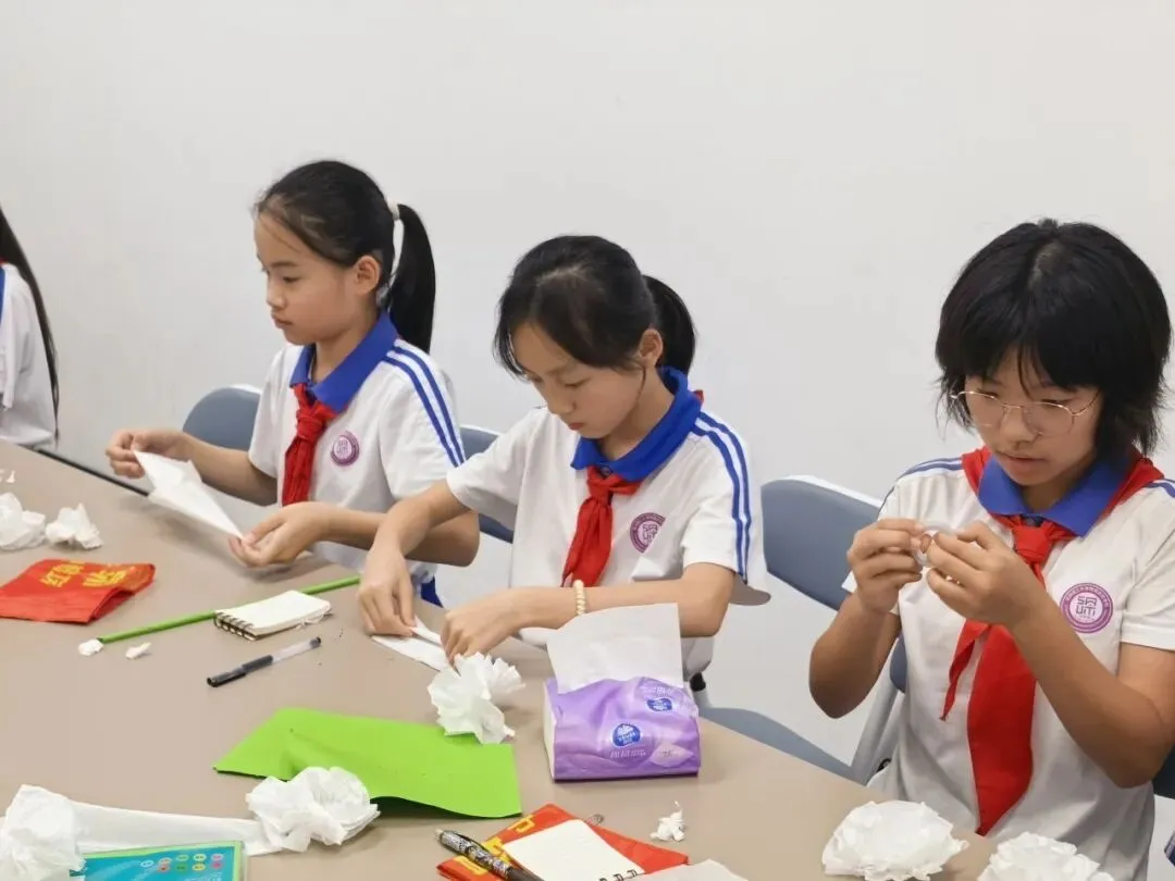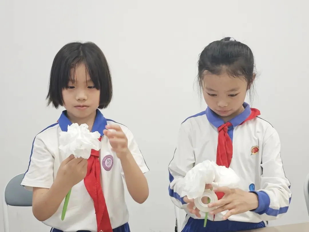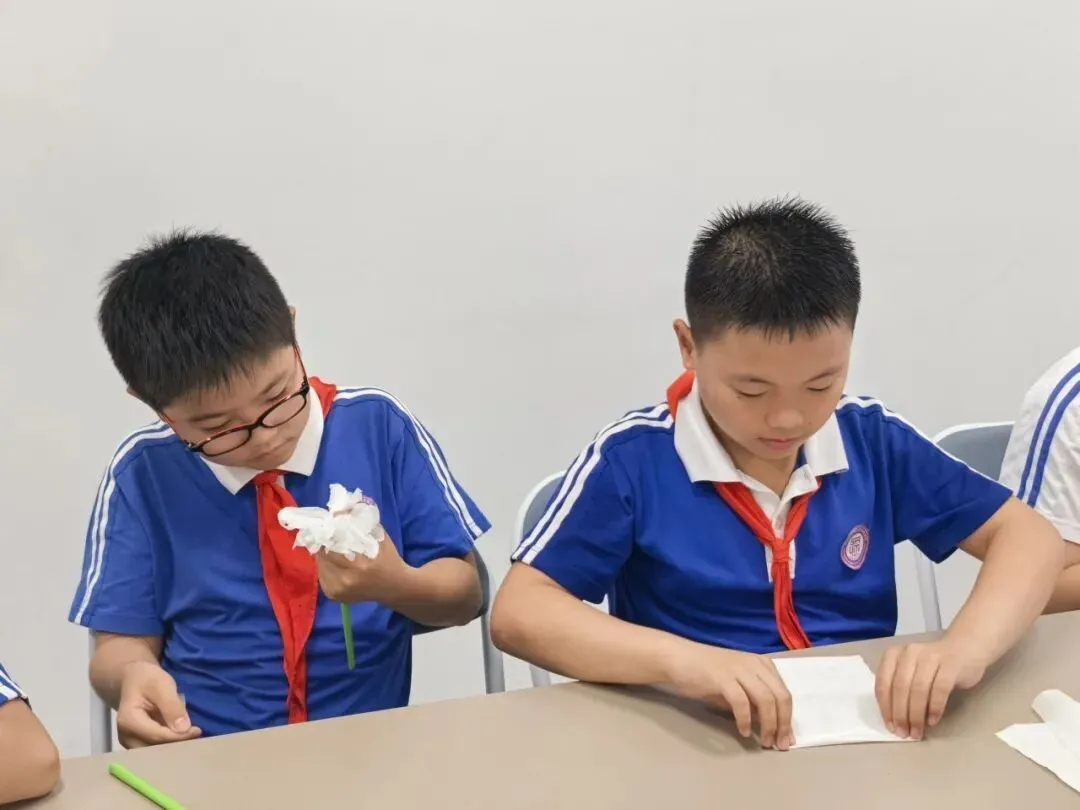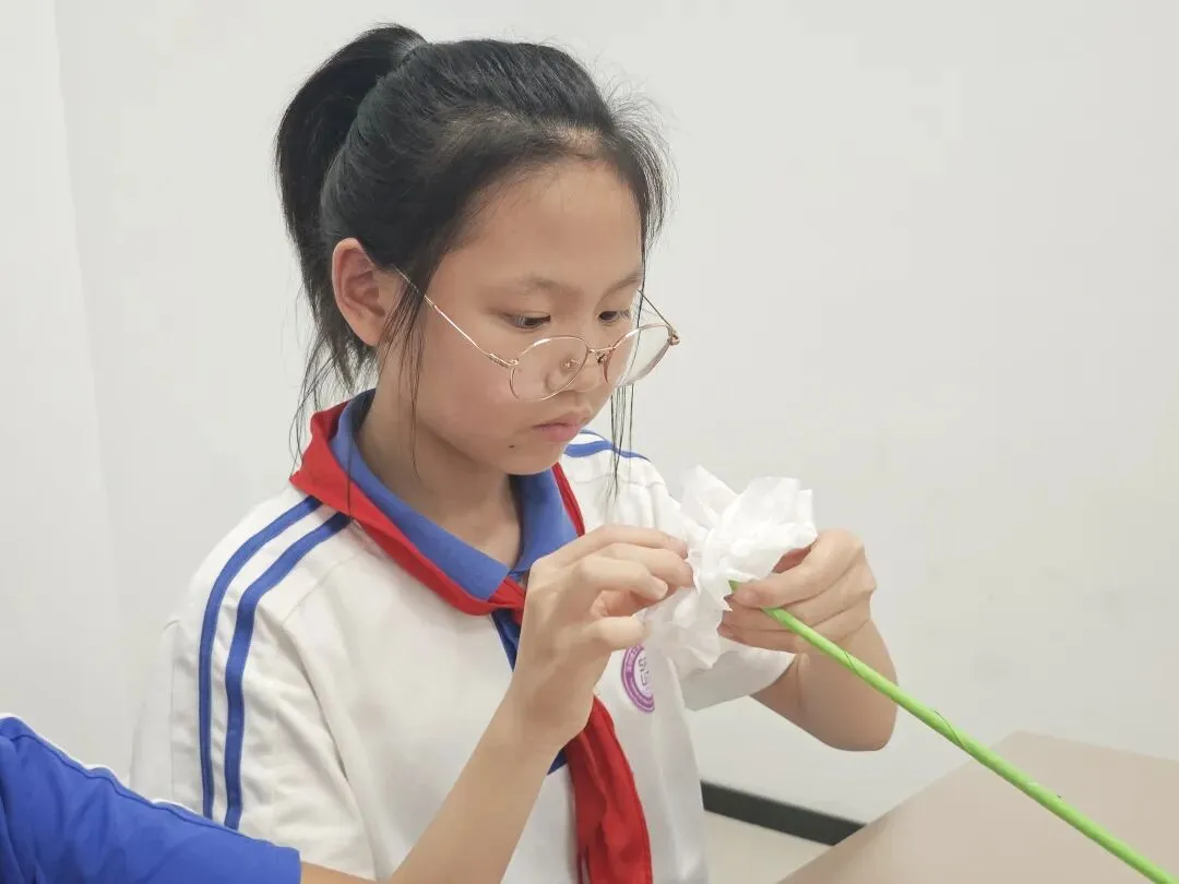 活动前两日,校园已浸在清和肃穆的氛围里,静穆中透着温暖。小学少先队员代表围坐一处,在老师的轻声指引下折花寄思。素白纸巾层层轻叠,指尖婉转翻飞,一朵朵纸花于掌心缓缓绽放;卡纸随剪刀轻剪舒展成瓣,将对先烈的虔敬与追思,细细揉进每一道褶皱、每一片花瓣。那些素净洁白的小花,承载着少年最纯粹的敬意,让缅怀在指尖流转、在心底沉淀。