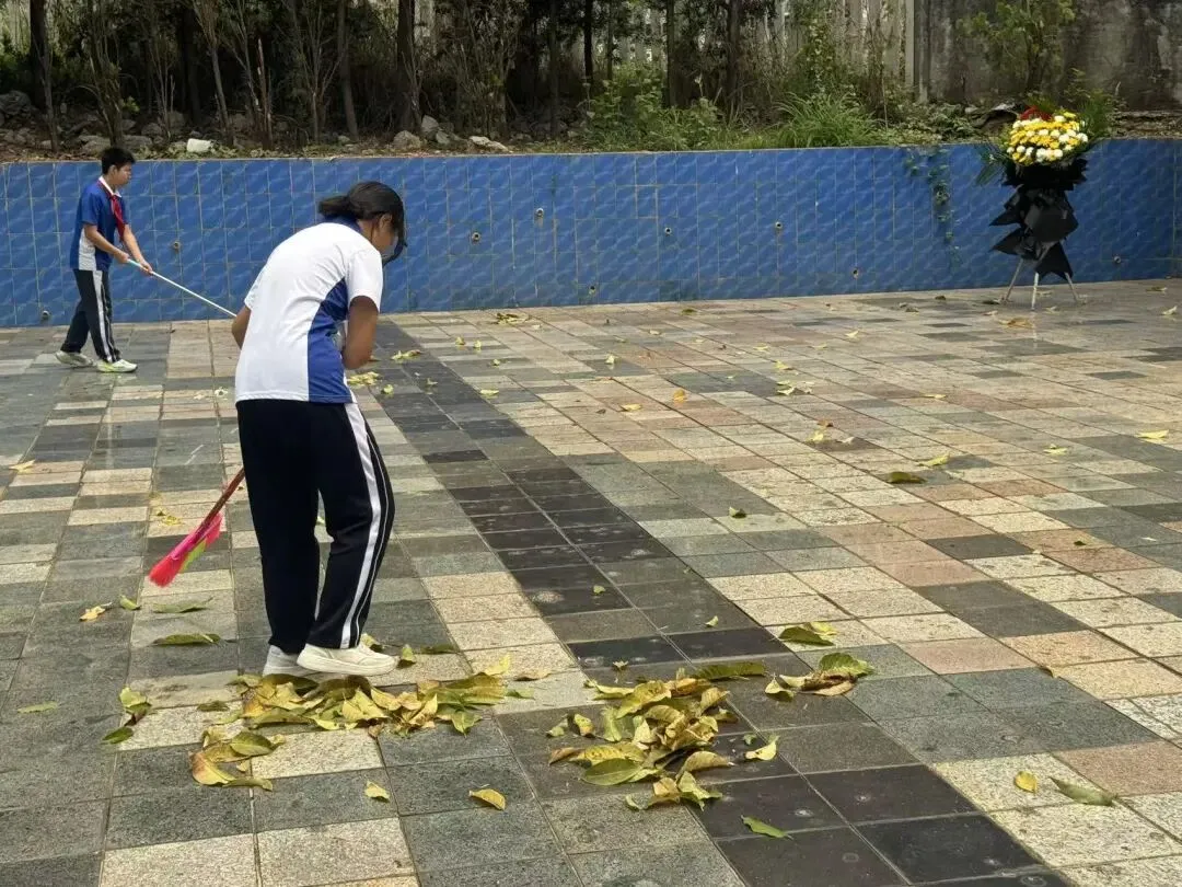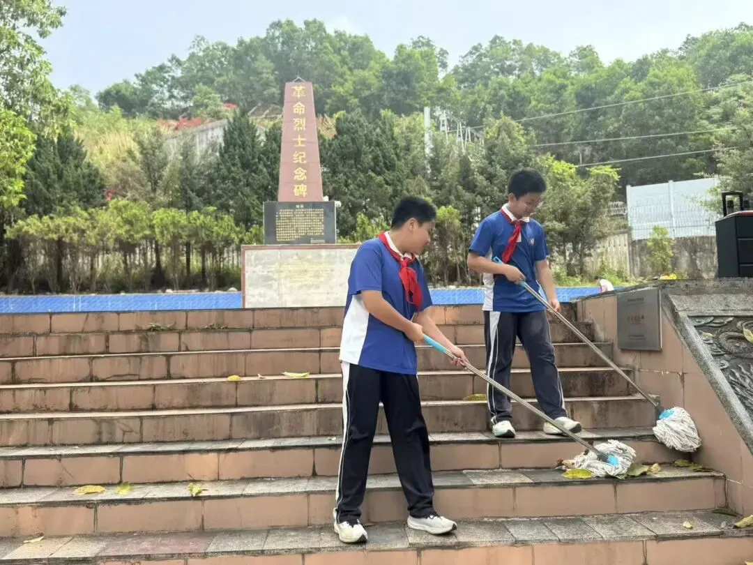 祭扫当日,班主任以温厚叮咛传递庄重之心,引导孩子们以虔诚肃穆之态赴这场缅怀之约。由七年级学生代表与教师组成的先锋队伍早早启程,携扫帚、抹布等清洁物资,提前奔赴大马山纪念碑。他们细心拂拭碑身尘迹,静静清扫广场苔痕,以双手整理出一片洁净庄严,让英雄丰碑在春风暖阳中更显巍峨静穆、熠熠生辉。