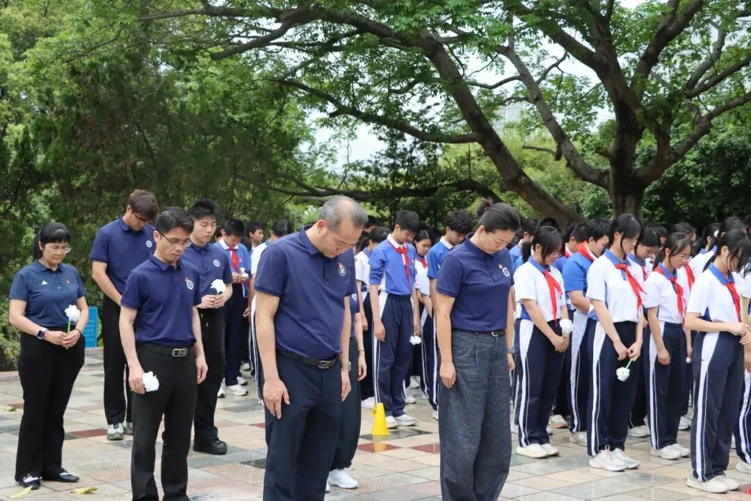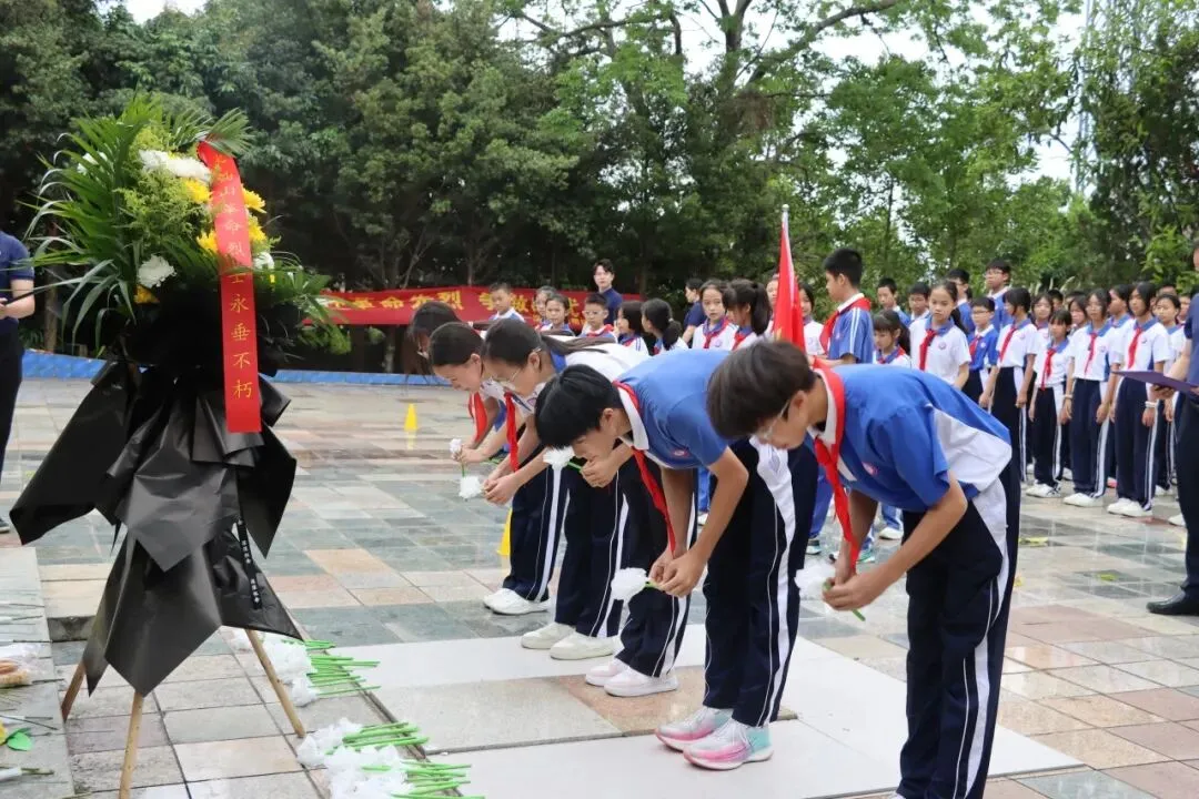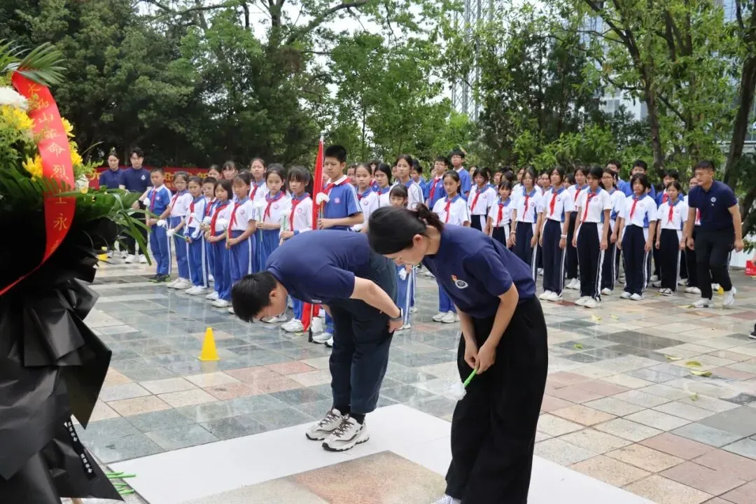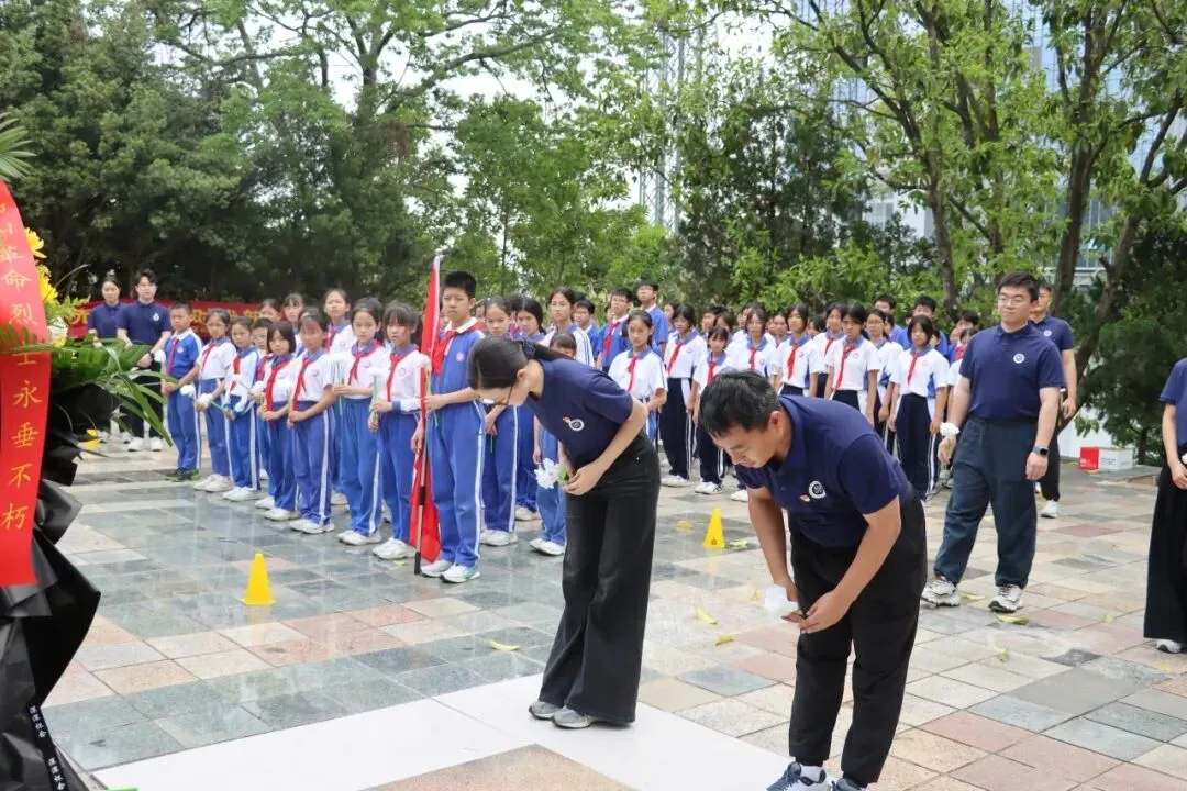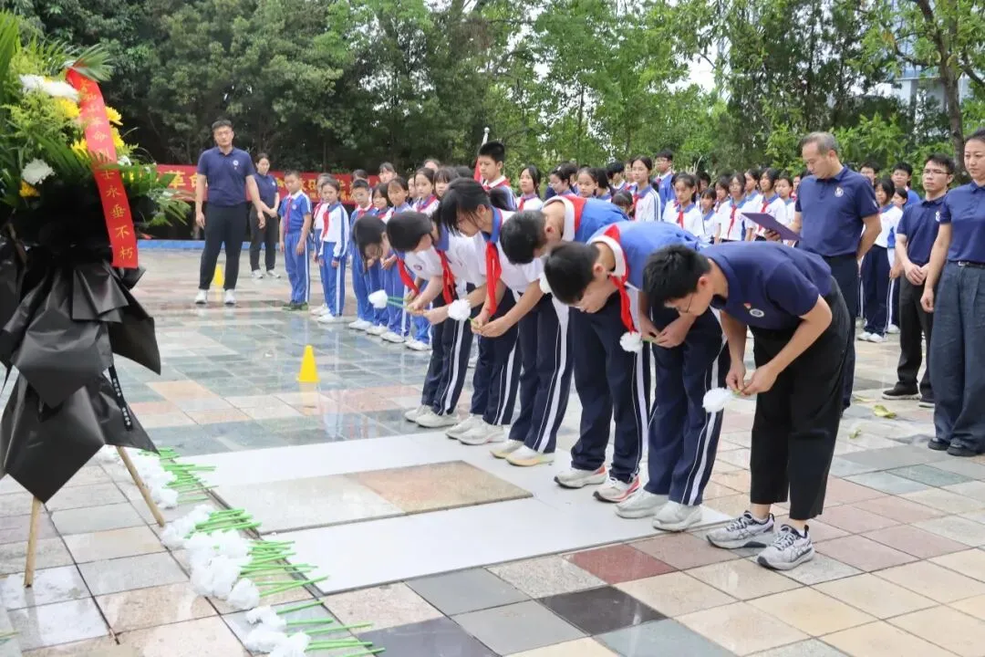 师生依次上前,俯身轻献纸花。素白花瓣铺满碑前,如一片敬意之海,阳光洒落,光影斑驳,恰似英雄精神以温柔之姿,守护新一代追梦者。