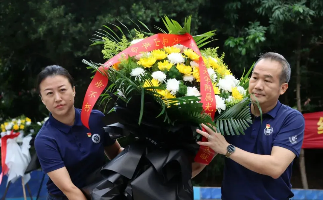 校领导缓步上前,敬献花圈、轻理缎带。一捧繁花,一腔敬意,静静伫立在丰碑之前,如不灭灯塔,照亮来路与前程。