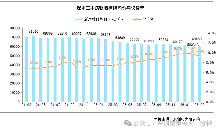 3月深圳楼市小阳春再现,市场热度提升,业主信心显著修复。据深圳贝壳研究院监测,3月深圳二手房新增挂牌均价59580元/平方米,环比上涨0.9%。议价空间方面,3月议价率为9.2%,环比缩小0.6%。