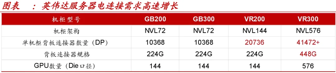但在未来VR200 NVL144、VR300 NVL576机柜中,有望分别采用20736DP的224G连接器和41472DP以上的448G连接器。