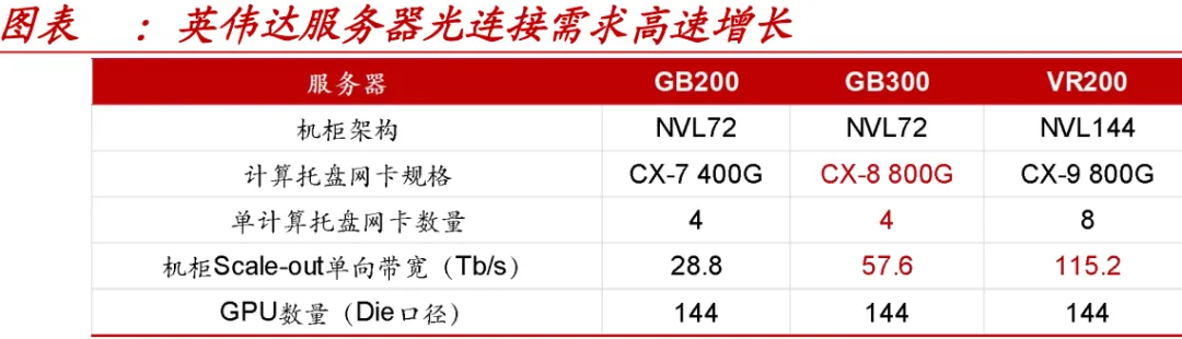 在AI快速发展下,海外一线云厂商正大规模采用800G光模块,并逐渐朝1.6T升级;比如英伟达GB300、VR200机柜,均采用800G光模块。