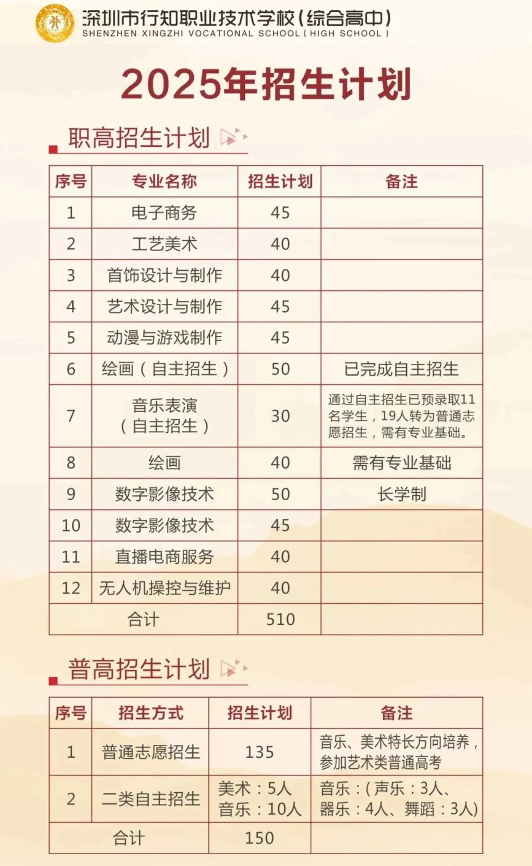 2025年共计划招生 510人,510人(提供80个床位),综合高中150人(住宿)。